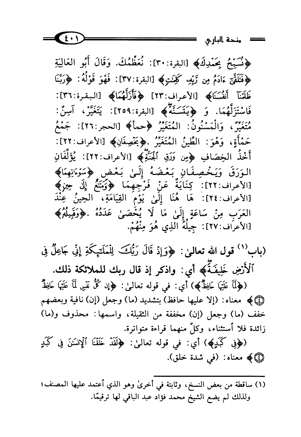 (باب (¬1) قول الله تعالى: {وَإِذْ قَال رَبُّكَ لِلْمَلَائِكَةِ إِنِّي جَاعِلٌ فِي الْأَرْضِ خَلِيفَةً}