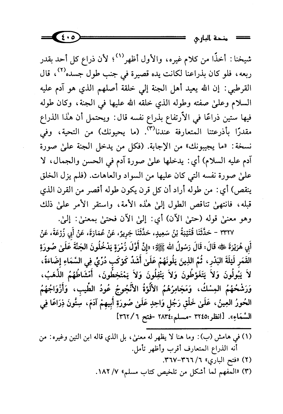 3327 - حَدَّثَنَا قُتَيْبَةُ بْنُ سَعِيدٍ، حَدَّثَنَا جَرِيرٌ، عَنْ عُمَارَةَ، عَنْ أَبِي زُرْعَةَ، عَنْ أَبِي هُرَيْرَةَ رَضِيَ اللَّهُ عَنْهُ، قَال: قَال رَسُولُ اللَّهِ صَلَّى اللهُ عَلَيْهِ وَسَلَّمَ: "إِنَّ أَوَّلَ زُمْرَةٍ يَدْخُلُونَ الجَنَّةَ عَلَى صُورَةِ القَمَرِ لَيْلَةَ البَدْرِ، ثُمَّ الَّذِينَ يَلُونَهُمْ عَلَى أَشَدِّ كَوْكَبٍ دُرِّيٍّ فِي السَّمَاءِ إِضَاءَةً، لَا يَبُولُونَ وَلَا يَتَغَوَّطُونَ، وَلَا يَتْفِلُونَ وَلَا يَمْتَخِطُونَ، أَمْشَاطُهُمُ الذَّهَبُ، وَرَشْحُهُمُ المِسْكُ، وَمَجَامِرُهُمْ الأَلُوَّةُ الأَنْجُوجُ، عُودُ الطِّيبِ وَأَزْوَاجُهُمُ الحُورُ العِينُ، عَلَى خَلْقِ رَجُلٍ وَاحِدٍ، عَلَى صُورَةِ أَبِيهِمْ آدَمَ، سِتُّونَ ذِرَاعًا فِي السَّمَاءِ".