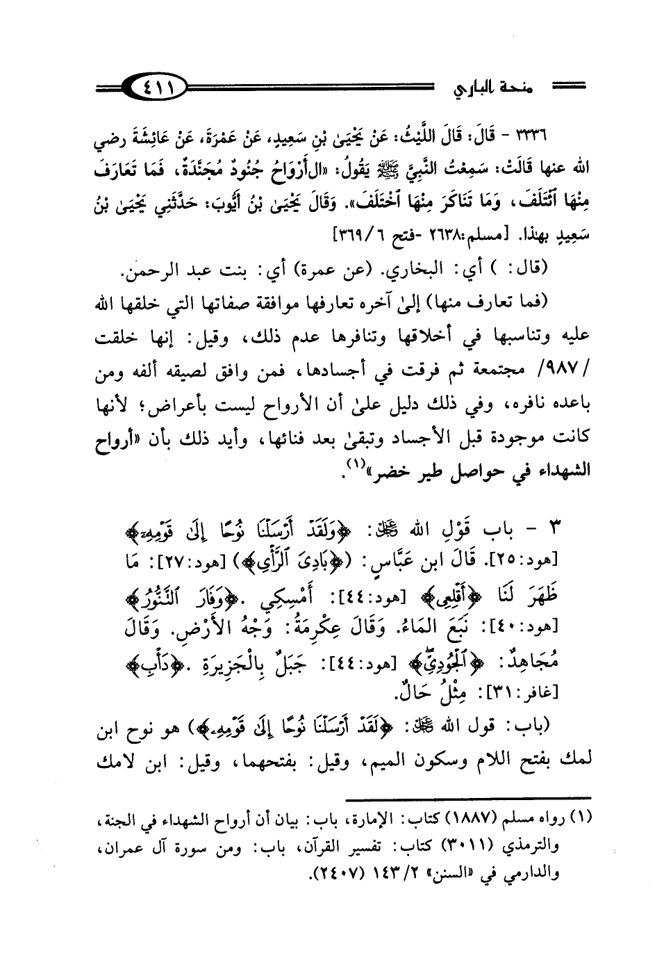 3336 - قَال قَال اللَّيْثُ، عَنْ يَحْيَى بْنِ سَعِيدٍ، عَنْ عَمْرَةَ، عَنْ عَائِشَةَ رَضِيَ اللَّهُ عَنْهَا، قَالتْ: سَمِعْتُ النَّبِيَّ صَلَّى اللهُ عَلَيْهِ وَسَلَّمَ، يَقُولُ: "الأَرْوَاحُ جُنُودٌ مُجَنَّدَةٌ فَمَا تَعَارَفَ مِنْهَا ائْتَلَفَ، وَمَا تَنَاكَرَ مِنْهَا اخْتَلَفَ" وَقَال يَحْيَى بْنُ أَيُّوبَ، حَدَّثَنِي يَحْيَى بْنُ سَعِيدٍ بِهَذَا.