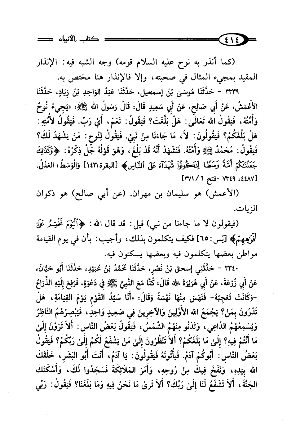 3340 - حَدَّثَنِي إِسْحَاقُ بْنُ نَصْرٍ، حَدَّثَنَا مُحَمَّدُ بْنُ عُبَيْدٍ، حَدَّثَنَا أَبُو حَيَّانَ، عَنْ أَبِي زُرْعَةَ، عَنْ أَبِي هُرَيْرَةَ رَضِيَ اللَّهُ عَنْهُ، قَال: كُنَّا مَعَ النَّبِيِّ صَلَّى اللهُ عَلَيْهِ وَسَلَّمَ فِي دَعْوَةٍ، "فَرُفِعَ إِلَيْهِ الذِّرَاعُ، وَكَانَتْ تُعْجِبُهُ فَنَهَسَ مِنْهَا نَهْسَةً" وَقَال: "أَنَا سَيِّدُ القَوْمِ يَوْمَ القِيَامَةِ، هَلْ تَدْرُونَ بِمَ؟ يَجْمَعُ اللَّهُ الأَوَّلِينَ وَالآخِرِينَ فِي صَعِيدٍ وَاحِدٍ، فَيُبْصِرُهُمُ النَّاظِرُ وَيُسْمِعُهُمُ الدَّاعِي، وَتَدْنُو مِنْهُمُ الشَّمْسُ، فَيَقُولُ بَعْضُ النَّاسِ: أَلا تَرَوْنَ إِلَى مَا أَنْتُمْ فِيهِ، إِلَى مَا بَلَغَكُمْ؟ أَلا تَنْظُرُونَ إِلَى مَنْ يَشْفَعُ لَكُمْ إِلَى رَبِّكُمْ، فَيَقُولُ بَعْضُ النَّاسِ: أَبُوكُمْ آدَمُ فَيَأْتُونَهُ فَيَقُولُونَ: يَا آدَمُ أَنْتَ أَبُو البَشَرِ، خَلَقَكَ اللَّهُ بِيَدِهِ، وَنَفَخَ فِيكَ مِنْ رُوحِهِ، وَأَمَرَ المَلائِكَةَ فَسَجَدُوا لَكَ، وَأَسْكَنَكَ الجَنَّةَ، أَلا تَشْفَعُ لَنَا إِلَى رَبِّكَ، أَلا تَرَى مَا نَحْنُ فِيهِ وَمَا بَلَغَنَا؟ فَيَقُولُ: رَبِّي