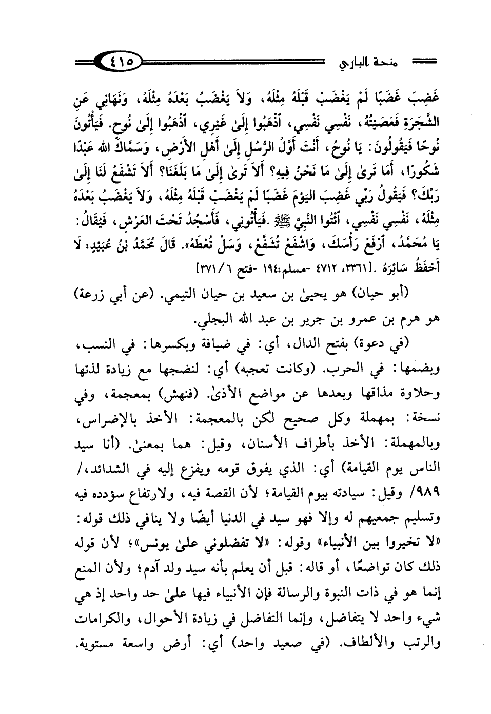 (في دعوة) بفتح الدال، أي: في ضيافة وبكسرها: في النسب، وبضمها: في الحرب. (وكانت تعجبه) أي: لنضجها مع زيادة لذتها وحلاوة مذاقها وبعدها عن مواضع الأذى. (فنهش) بمعجمة، وفي نسخة: بمهملة وكل صحيح لكن بالمعجمة: الأخذ بالأضراس، وبالمهملة: الأخذ بأطراف الأسنان، وقيل: هما بمعنى. (أنا سيد الناس يوم القيامة) أي: الذي يفوق قومه ويفزع إليه في الشدائد، وقيل: سيادته بيوم القيامة؛ لأن القصة فيه، ولارتفاع سؤدده فيه وتسليم جميعهم له وإلا فهو سيد في الدنيا أيضًا ولا ينافي ذلك قوله: "لا تخيروا بين الأنبياء" وقوله: "لا تفضلوني على يونس"؛ لأن قوله ذلك كان تواضعًا، أو قاله: قبل أن يعلم بأنه سيد ولد آدم؛ ولأن المنع إنما هو في ذات النبوة والرسالة فإن الأنبياء فيها على حد واحد إذ هي شيء واحد لا يتفاضل، وإنما التفاضل في زيادة الأحوال، والكرامات والرتب والألطاف. (في صعيد واحد) أي: أرض واسعة مستوية.