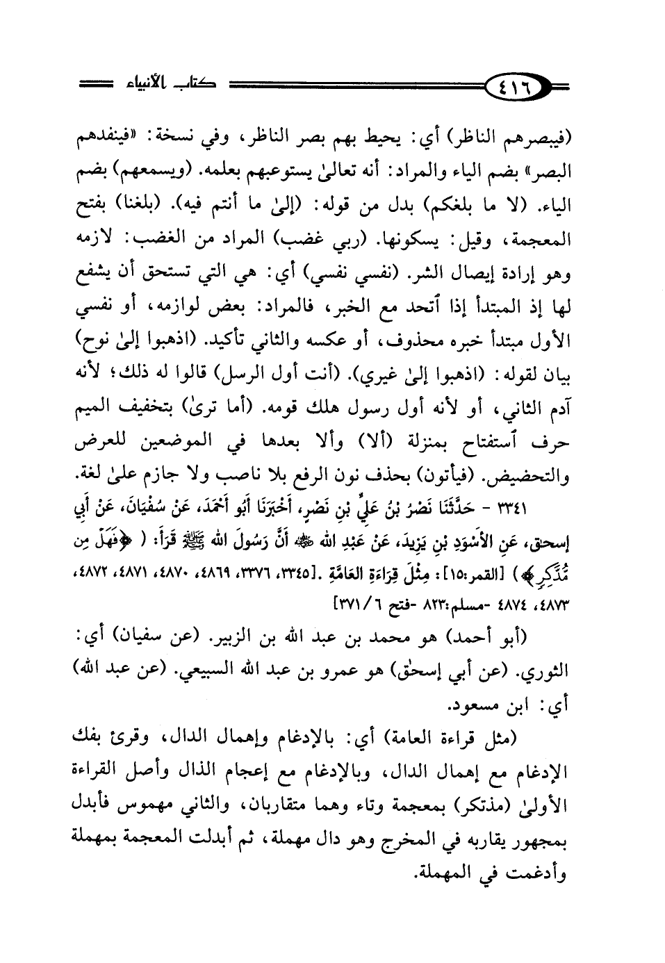 3341 - حَدَّثَنَا نَصْرُ بْنُ عَلِيِّ بْنِ نَصْرٍ، أَخْبَرَنَا أَبُو أَحْمَدَ، عَنْ سُفْيَانَ، عَنْ أَبِي إِسْحَاقَ، عَنِ الأَسْوَدِ بْنِ يَزِيدَ، عَنْ عَبْدِ اللَّهِ رَضِيَ اللَّهُ عَنْهُ، أَنَّ رَسُولَ اللَّهِ صَلَّى اللهُ عَلَيْهِ وَسَلَّمَ قَرَأَ "فَهَلْ مِنْ مُدَّكِرٍ" مِثْلَ قِرَاءَةِ العَامَّةِ.