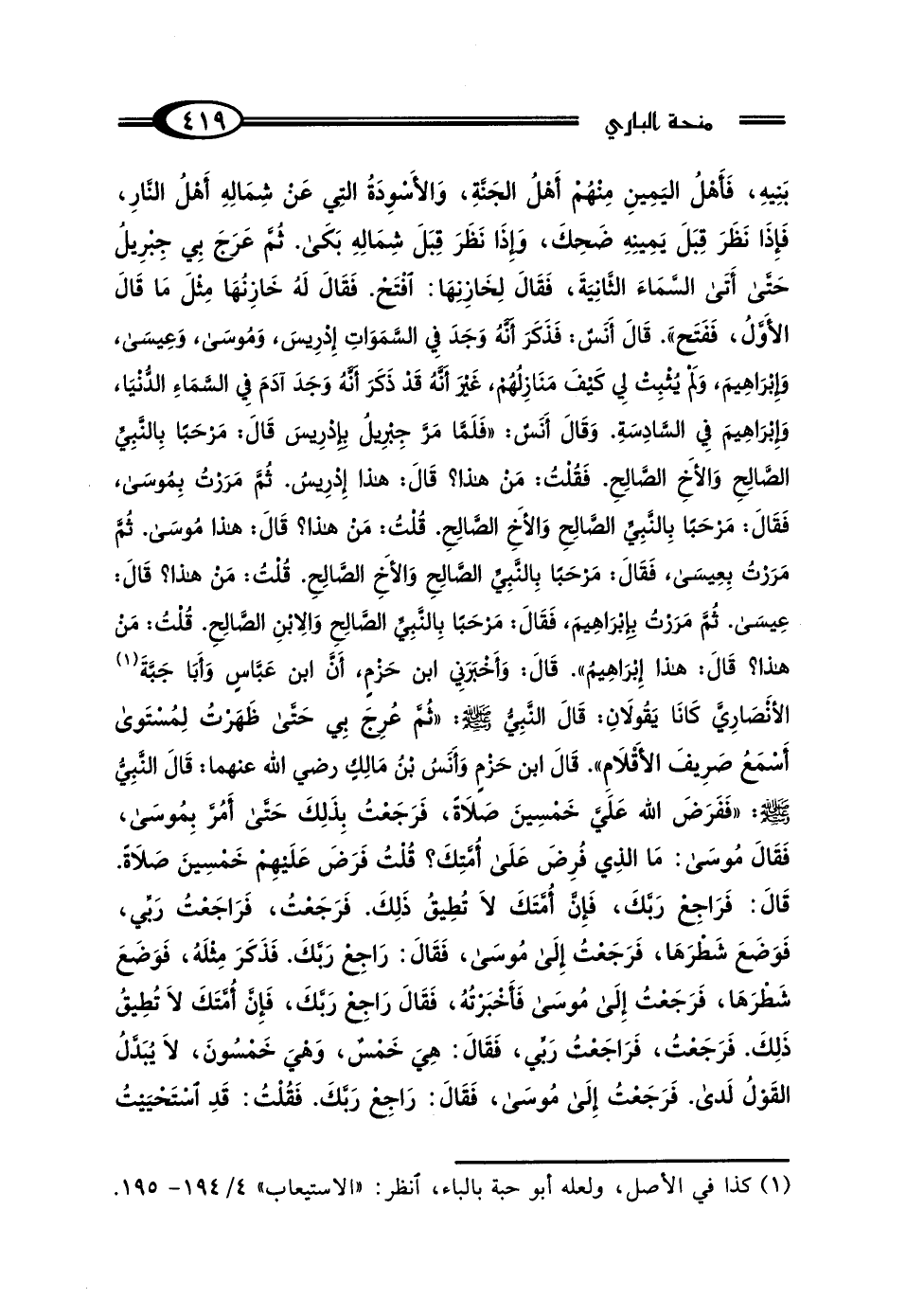 بَنِيهِ، فَأَهْلُ اليَمِينِ مِنْهُمْ أَهْلُ الجَنَّةِ، وَالأَسْودَةُ الَّتِي عَنْ شِمَالِهِ أَهْلُ النَّارِ، فَإِذَا نَظَرَ قِبَلَ يَمِينِهِ ضَحِكَ، وَإِذَا نَظَرَ قِبَلَ شِمَالِهِ بَكَى، ثُمَّ عَرَجَ بِي جِبْرِيلُ حَتَّى أَتَى السَّمَاءَ الثَّانِيَةَ، فَقَال لِخَازِنِهَا: افْتَحْ، فَقَال لَهُ خَازِنُهَا مِثْلَ مَا قَال الأَوَّلُ فَفَتَحَ " قَال أَنَسٌ: فَذَكَرَ أَنَّهُ وَجَدَ فِي السَّمَوَاتِ إِدْرِيسَ، وَمُوسَى، وَعِيسَى، وَإِبْرَاهِيمَ وَلَمْ يُثْبِتْ لِي كَيْفَ مَنَازِلُهُمْ، غَيْرَ أَنَّهُ قَدْ ذَكَرَ: أَنَّهُ وَجَدَ آدَمَ فِي السَّمَاءِ الدُّنْيَا، وَإِبْرَاهِيمَ فِي السَّادِسَةِ، وَقَال أَنَسٌ: فَلَمَّا مَرَّ جِبْرِيلُ بِإِدْرِيسَ قَال: مَرْحَبًا بِالنَّبِيِّ الصَّالِحِ وَالأَخِ الصَّالِحِ، فَقُلْتُ مَنْ هَذَا قَال هَذَا إِدْرِيسُ، ثُمَّ مَرَرْتُ بِمُوسَى فَقَال: مَرْحَبًا بِالنَّبِيِّ الصَّالِحِ وَالأَخِ الصَّالِحِ، قُلْتُ مَنْ هَذَا قَال هَذَا مُوسَى، ثُمَّ مَرَرْتُ بِعِيسَى فَقَال: مَرْحَبًا بِالنَّبِيِّ الصَّالِحِ وَالأَخِ الصَّالِحِ، قُلْتُ مَنْ هَذَا قَال عِيسَى، ثُمَّ مَرَرْتُ بِإِبْرَاهِيمَ فَقَال: مَرْحَبًا بِالنَّبِيِّ الصَّالِحِ وَالابْنِ الصَّالِحِ، قُلْتُ مَنْ هَذَا، قَال: هَذَا إِبْرَاهِيمُ " قَال: وَأَخْبَرَنِي ابْنُ حَزْمٍ، أَنَّ ابْنَ عَبَّاسٍ، وَأَبَا جبة (¬1) الأَنْصَارِيَّ، كَانَا يَقُولانِ: قَال النَّبِيُّ صَلَّى اللهُ عَلَيْهِ وَسَلَّمَ: "ثُمَّ عُرِجَ بِي، حَتَّى ظَهَرْتُ لِمُسْتَوًى أَسْمَعُ صَرِيفَ الأَقْلامِ"، قَال ابْنُ حَزْمٍ، وَأَنَسُ بْنُ مَالِكٍ رَضِيَ اللَّهُ عَنْهُمَا، قَال النَّبِيُّ صَلَّى اللهُ عَلَيْهِ وَسَلَّمَ: "فَفَرَضَ اللَّهُ عَلَيَّ خَمْسِينَ صَلاةً، فَرَجَعْتُ بِذَلِكَ حَتَّى أَمُرَّ بِمُوسَى، فَقَال: مُوسَى مَا الَّذِي فَرَضَ عَلَى أُمَّتِكَ؟ قُلْتُ: فَرَضَ عَلَيْهِمْ خَمْسِينَ صَلاةً، قَال: فَرَاجِعْ رَبَّكَ، فَإِنَّ أُمَّتَكَ لَا تُطِيقُ ذَلِكَ، فَرَجَعْتُ فَرَاجَعْتُ رَبِّي فَوَضَعَ شَطْرَهَا، فَرَجَعْتُ إِلَى مُوسَى، فَقَال رَاجِعْ رَبَّكَ: فَذَكَرَ مِثْلَهُ، فَوَضَعَ شَطْرَهَا، فَرَجَعْتُ إِلَى مُوسَى فَأَخْبَرْتُهُ فَقَال: رَاجِعْ رَبَّكَ، فَإِنَّ أُمَّتَكَ لَا تُطِيقُ ذَلِكَ، فَرَجَعْتُ فَرَاجَعْتُ رَبِّي، فَقَال: هِيَ خَمْسٌ وَهِيَ خَمْسُونَ، لَا يُبَدَّلُ القَوْلُ لَدَيَّ، فَرَجَعْتُ إِلَى مُوسَى، فَقَال رَاجِعْ رَبَّكَ، فَقُلْتُ: قَدِ اسْتَحْيَيْتُ