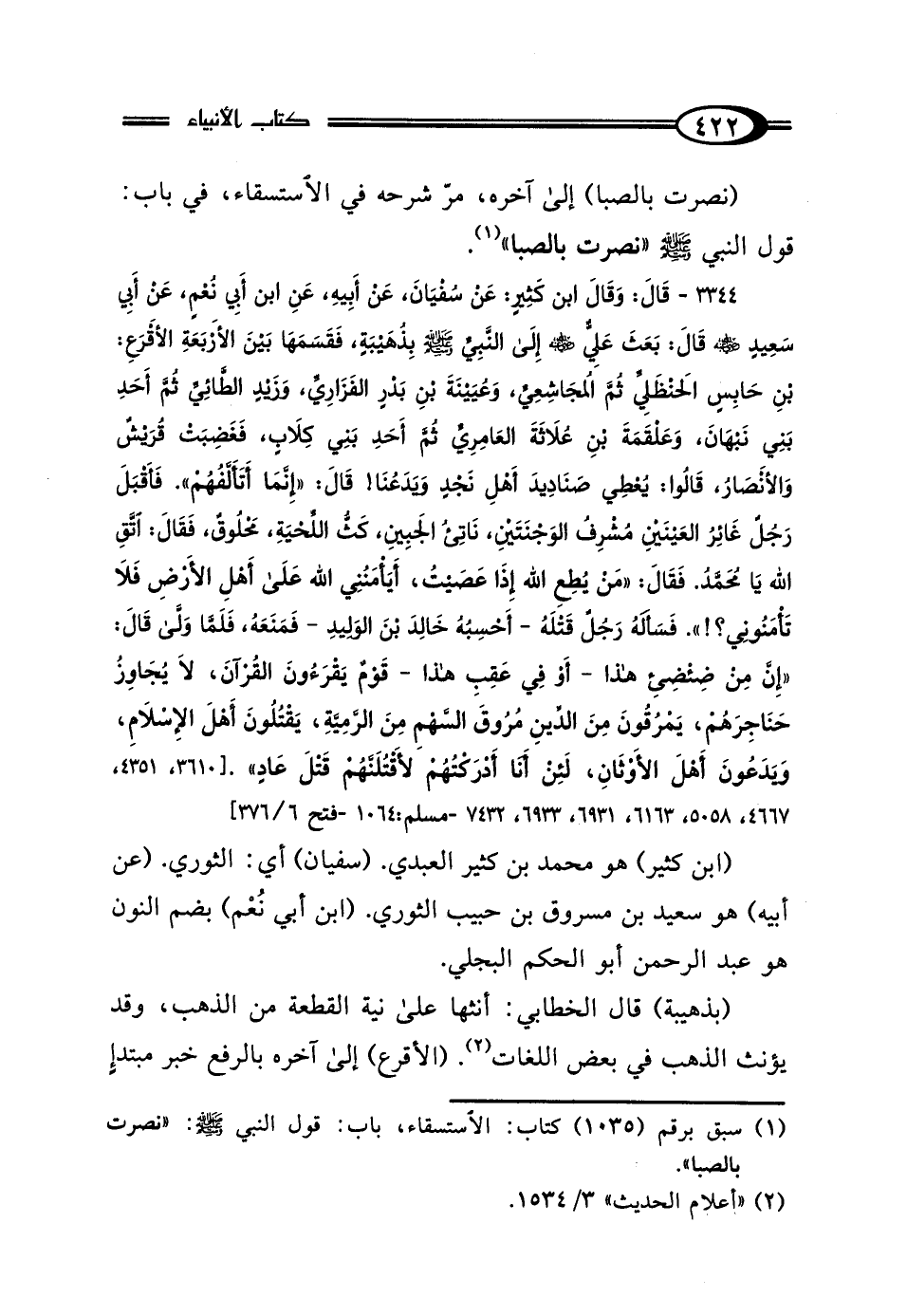 3344 - قَال: وَقَال ابْنُ كَثِيرٍ، عَنْ سُفْيَانَ، عَنْ أَبِيهِ، عَنْ ابْنِ أَبِي نُعْمٍ، عَنْ أَبِي سَعِيدٍ رَضِيَ اللَّهُ عَنْهُ، قَال: بَعَثَ عَلِيٌّ رَضِيَ اللَّهُ عَنْهُ، إِلَى النَّبِيِّ صَلَّى اللهُ عَلَيْهِ وَسَلَّمَ بِذُهَيْبَةٍ فَقَسَمَهَا بَيْنَ الأَرْبَعَةِ الأَقْرَعِ بْنِ حَابِسٍ الحَنْظَلِيِّ، ثُمَّ المُجَاشِعِيِّ، وَعُيَيْنَةَ بْنِ بَدْرٍ الفَزَارِيِّ، وَزَيْدٍ الطَّائِيِّ، ثُمَّ أَحَدِ بَنِي نَبْهَانَ، وَعَلْقَمَةَ بْنِ عُلاثَةَ العَامِرِيِّ، ثُمَّ أَحَدِ بَنِي كِلابٍ، فَغَضِبَتْ قُرَيْشٌ، وَالأَنْصَارُ، قَالُوا: يُعْطِي صَنَادِيدَ أَهْلِ نَجْدٍ وَيَدَعُنَا، قَال: "إِنَّمَا أَتَأَلَّفُهُمْ". فَأَقْبَلَ رَجُلٌ غَائِرُ العَيْنَيْنِ، مُشْرِفُ الوَجْنَتَيْنِ، نَاتِئُ الجَبِينِ، كَثُّ اللِّحْيَةِ مَحْلُوقٌ، فَقَال: اتَّقِ اللَّهَ يَا مُحَمَّدُ، فَقَال: "مَنْ يُطِعِ اللَّهَ إِذَا عَصَيْتُ؟ أَيَأْمَنُنِي اللَّهُ عَلَى أَهْلِ الأَرْضِ فَلَا تَأْمَنُونِي" فَسَأَلَهُ رَجُلٌ قَتْلَهُ، - أَحْسِبُهُ خَالِدَ بْنَ الوَلِيدِ - فَمَنَعَهُ، فَلَمَّا وَلَّى قَال: "إِنَّ مِنْ ضِئْضِئِ هَذَا، أَوْ: فِي عَقِبِ هَذَا قَوْمًا يَقْرَءُونَ القُرْآنَ لَا يُجَاوزُ حَنَاجِرَهُمْ، يَمْرُقُونَ مِنَ الدِّينِ مُرُوقَ السَّهْمِ مِنَ الرَّمِيَّةِ، يَقْتُلُونَ أَهْلَ الإِسْلامِ وَيَدَعُونَ أَهْلَ الأَوْثَانِ، لَئِنْ أَنَا أَدْرَكْتُهُمْ لَأَقْتُلَنَّهُمْ قَتْلَ عَادٍ".