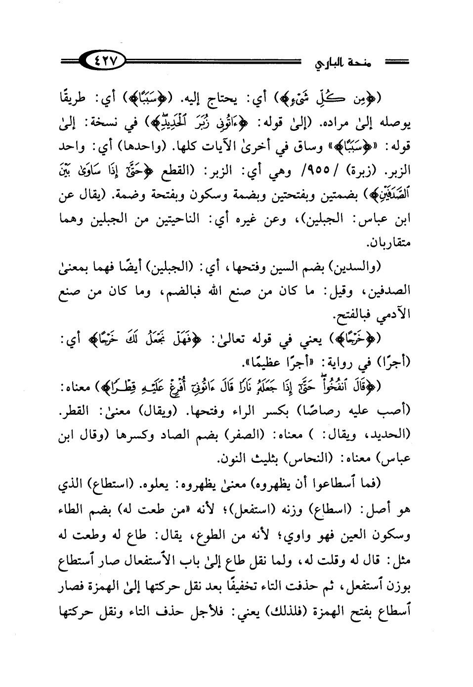 ({مِنْ كُلِّ شَيْءٍ}) أي: يحتاج إليه. ({سَبَبًا}) أي: طريقًا يوصله إلى مراده. (إلى قوله: {آتُونِي زُبَرَ الْحَدِيدِ}) في نسخة: إلى قوله: " {سَبَبًا} " وساق في أخرى الآيات كلها. (واحدها) أي: واحد الزبر. (زبرة) وهي أي: الزبر: (القطع {حَتَّى إِذَا سَاوَى بَيْنَ الصَّدَفَيْنِ}) بضمتين وبفتحتين وبضمة وسكون وبفتحة وضمة. (يقال عن ابن عباس: الجبلين)، وعن غيره أي: الناحيتين من الجبلين وهما متقاربان.