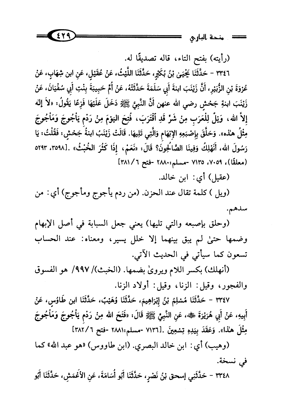 3346 - حَدَّثَنَا يَحْيَى بْنُ بُكَيْرٍ، حَدَّثَنَا اللَّيْثُ، عَنْ عُقَيْلٍ، عَنِ ابْنِ شِهَابٍ، عَنْ عُرْوَةَ بْنِ الزُّبَيْرِ، أَنَّ زَيْنَبَ بِنْتَ أَبِي سَلَمَةَ، حَدَّثَتْهُ عَنْ أُمِّ حَبِيبَةَ بِنْتِ أَبِي سُفْيَانَ، عَنْ زَيْنَبَ بِنْتِ جَحْشٍ، رَضِيَ اللَّهُ عَنْهُنَّ أَنَّ النَّبِيَّ صَلَّى اللهُ عَلَيْهِ وَسَلَّمَ، دَخَلَ عَلَيْهَا فَزِعًا يَقُولُ: "لَا إِلَهَ إلا اللَّهُ، وَيْلٌ لِلْعَرَبِ مِنْ شَرٍّ قَدِ اقْتَرَبَ، فُتِحَ اليَوْمَ مِنْ رَدْمِ يَأْجُوجَ وَمَأْجُوجَ مِثْلُ هَذِهِ" وَحَلَّقَ بِإِصْبَعِهِ الإِبْهَامِ وَالَّتِي تَلِيهَا، قَالتْ زَيْنَبُ بِنْتُ جَحْشٍ فَقُلْتُ يَا رَسُولَ اللَّهِ: أَنَهْلِكُ وَفِينَا الصَّالِحُونَ؟ قَال: "نَعَمْ إِذَا كَثُرَ الخَبَثُ".