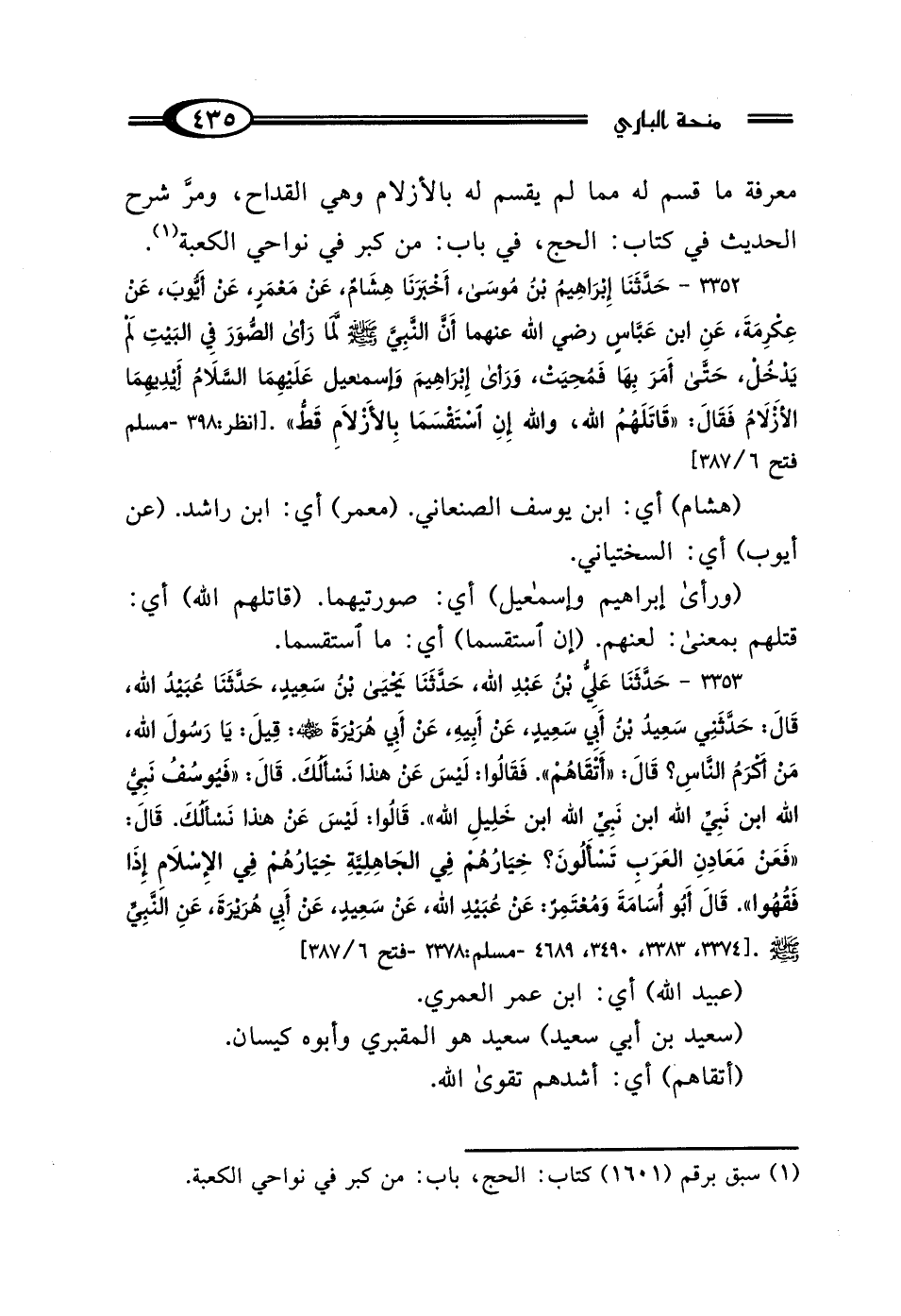 3352 - حَدَّثَنَا إِبْرَاهِيمُ بْنُ مُوسَى، أَخْبَرَنَا هِشَامٌ، عَنْ مَعْمَرٍ، عَنْ أَيُّوبَ، عَنْ عِكْرِمَةَ، عَنِ ابْنِ عَبَّاسٍ رَضِيَ اللَّهُ عَنْهُمَا، أَنَّ النَّبِيَّ صَلَّى اللهُ عَلَيْهِ وَسَلَّمَ، لَمَّا رَأَى الصُّوَرَ فِي البَيْتِ لَمْ يَدْخُلْ حَتَّى أَمَرَ بِهَا فَمُحِيَتْ، وَرَأَى إِبْرَاهِيمَ وَإِسْمَاعِيلَ عَلَيْهِمَا السَّلامُ بِأَيْدِيهِمَا الأَزْلامُ، فَقَال "قَاتَلَهُمُ اللَّهُ، وَاللَّهِ إِنِ اسْتَقْسَمَا بِالأَزْلامِ قَطُّ".
