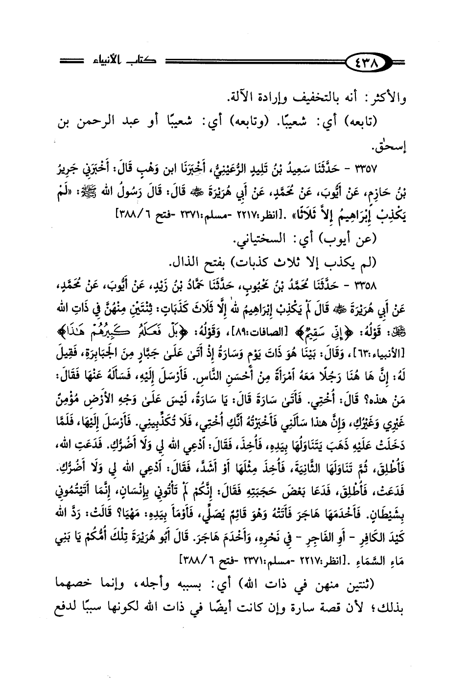 3357 - حَدَّثَنَا سَعِيدُ بْنُ تَلِيدٍ الرُّعَيْنِيُّ، أَخْبَرَنَا ابْنُ وَهْبٍ، قَال: أَخْبَرَنِي جَرِيرُ بْنُ حَازِمٍ، عَنْ أَيُّوبَ، عَنْ مُحَمَّدٍ، عَنْ أَبِي هُرَيْرَةَ رَضِيَ اللَّهُ عَنْهُ، قَال: قَال رَسُولُ اللَّهِ صَلَّى اللهُ عَلَيْهِ وَسَلَّمَ: "لَمْ يَكْذِبْ إِبْرَاهِيمُ إلا ثَلاثًا".
