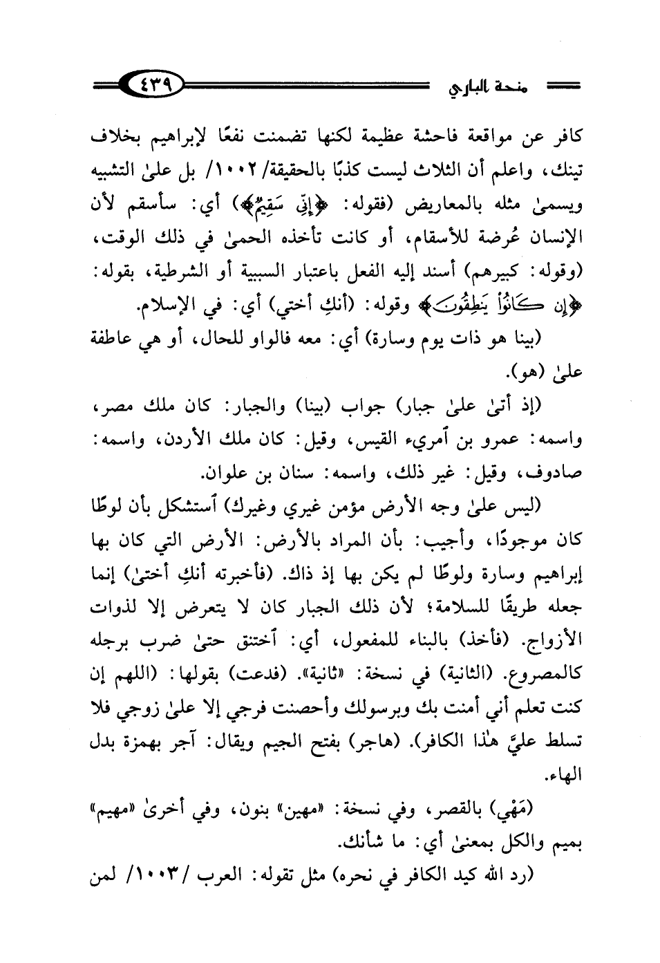 (ليس على وجه الأرض مؤمن غيري وغيرك) استشكل بأن لوطًا كان موجودًا، وأجيب: بأن المراد بالأرض: الأرض التي كان بها إبراهيم وسارة ولوطًا لم يكن بها إذ ذاك. (فأخبرته أنكِ أختي) إنما جعله طريقًا للسلامة؛ لأن ذلك الجبار كان لا يتعرض إلا لذوات الأزواج. (فأخذ) بالبناء للمفعول، أي: اختنق حتى ضرب برجله كالمصروع. (الثانية) في نسخة: "ثانية". (فدعت) بقولها: (اللهم إن كنت تعلم أني أمنت بك وبرسولك وأحصنت فرجي إلا على زوجي فلا تسلط عليَّ هذا الكافر). (هاجر) بفتح الجيم ويقال: آجر بهمزة بدل الهاء.