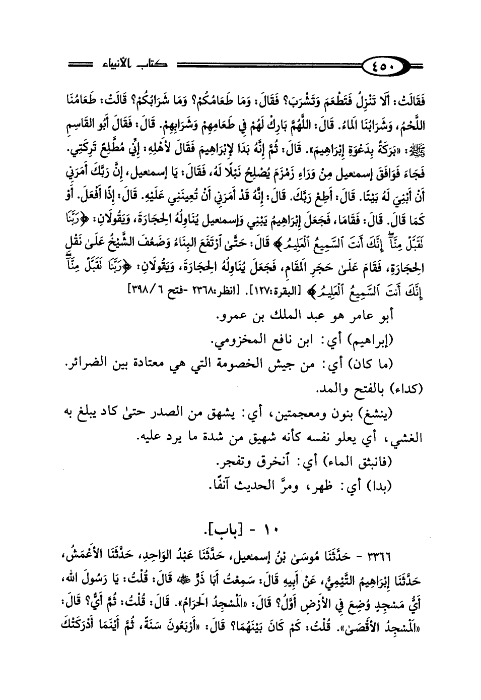 3366 - حَدَّثَنَا مُوسَى بْنُ إِسْمَاعِيلَ، حَدَّثَنَا عَبْدُ الوَاحِدِ، حَدَّثَنَا الأَعْمَشُ، حَدَّثَنَا إِبْرَاهِيمُ التَّيْمِيُّ، عَنْ أَبِيهِ، قَال: سَمِعْتُ أَبَا ذَرٍّ رَضِيَ اللَّهُ عَنْهُ، قَال: قُلْتُ يَا رَسُولَ اللَّهِ، أَيُّ مَسْجِدٍ وُضِعَ فِي الأَرْضِ أَوَّلَ؟ قَال: "المَسْجِدُ الحَرَامُ" قَال: قُلْتُ: ثُمَّ أَيٌّ؟ قَال "المَسْجِدُ الأَقْصَى" قُلْتُ: كَمْ كَانَ بَيْنَهُمَا؟ قَال: "أَرْبَعُونَ سَنَةً، ثُمَّ أَيْنَمَا أَدْرَكَتْكَ