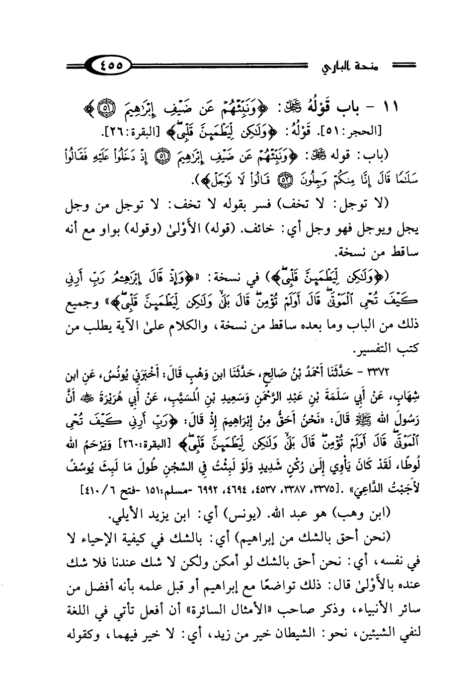 3372 - حَدَّثَنَا أَحْمَدُ بْنُ صَالِحٍ، حَدَّثَنَا ابْنُ وَهْبٍ، قَال: أَخْبَرَنِي يُونُسُ، عَنِ ابْنِ شِهَابٍ، عَنْ أَبِي سَلَمَةَ بْنِ عَبْدِ الرَّحْمَنِ، وَسَعِيدِ بْنِ المُسَيِّبِ، عَنْ أَبِي هُرَيْرَةَ رَضِيَ اللَّهُ عَنْهُ، أَنَّ رَسُولَ اللَّهِ صَلَّى اللهُ عَلَيْهِ وَسَلَّمَ، قَال: "نَحْنُ أَحَقُّ بِالشَّكِّ مِنْ إِبْرَاهِيمَ إِذْ قَال: {رَبِّ أَرِنِي كَيْفَ تُحْيِي المَوْتَى قَال أَوَلَمْ تُؤْمِنْ قَال بَلَى وَلَكِنْ لِيَطْمَئِنَّ قَلْبِي} [البقرة: 260] وَيَرْحَمُ اللَّهُ لُوطًا، لَقَدْ كَانَ يَأْوي إِلَى رُكْنٍ شَدِيدٍ، وَلَوْ لَبِثْتُ فِي السِّجْنِ طُولَ مَا لَبِثَ يُوسُفُ، لَأَجَبْتُ الدَّاعِيَ".