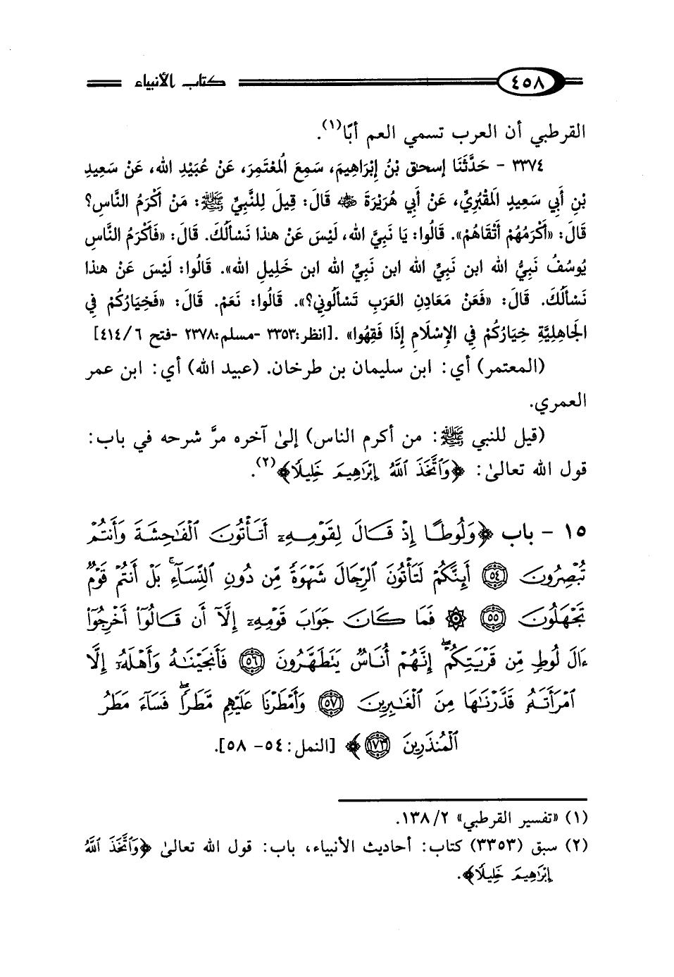15 - بَابُ {وَلُوطًا إِذْ قَالَ لِقَوْمِهِ أَتَأْتُونَ الفَاحِشَةَ وَأَنْتُمْ تُبْصِرُونَ. أَئِنَّكُمْ لَتَأْتُونَ الرِّجَالَ شَهْوَةً مِنْ دُونِ النِّسَاءِ بَلْ أَنْتُمْ قَوْمٌ تَجْهَلُونَ. فَمَا كَانَ جَوَابَ قَوْمِهِ إِلَّا أَنْ قَالُوا أَخْرِجُوا آلَ لُوطٍ مِنْ قَرْيَتِكُمْ إِنَّهُمْ أُنَاسٌ يَتَطَهَّرُونَ. فَأَنْجَيْنَاهُ وَأَهْلَهُ إِلَّا امْرَأَتَهُ قَدَّرْنَاهَا مِنَ الغَابِرِينَ. وَأَمْطَرْنَا عَلَيْهِمْ مَطَرًا فَسَاءَ مَطَرُ المُنْذَرِينَ} [النمل: 54 - 58].