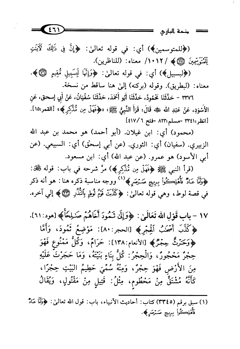 3376 - حَدَّثَنَا مَحْمُودٌ، حَدَّثَنَا أَبُو أَحْمَدَ، حَدَّثَنَا سُفْيَانُ، عَنْ أَبِي إِسْحَاقَ، عَنِ الأَسْوَدِ، عَنْ عَبْدِ اللَّهِ رَضِيَ اللَّهُ عَنْهُ، قَال: "قَرَأَ النَّبِيُّ صَلَّى اللهُ عَلَيْهِ وَسَلَّمَ: {فَهَلْ مِنْ مُدَّكِرٍ} [القمر: 15] ".