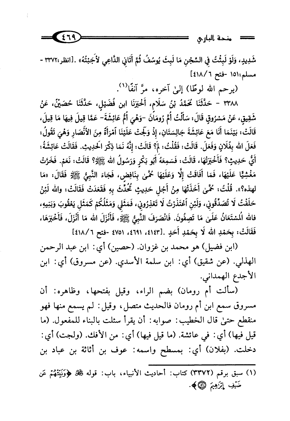 3388 - حَدَّثَنَا مُحَمَّدُ بْنُ سَلامٍ، أَخْبَرَنَا ابْنُ فُضَيْلٍ، حَدَّثَنَا حُصَيْنٌ، عَنْ شَقِيقٍ، عَنْ مَسْرُوقٍ، قَال: سَأَلْتُ أُمَّ رُومَانَ، وَهِيَ أُمُّ عَائِشَةَ، عَمَّا قِيلَ فِيهَا مَا قِيلَ، قَالتْ: بَيْنَمَا أَنَا مَعَ عَائِشَةَ جَالِسَتَانِ، إِذْ وَلَجَتْ عَلَيْنَا امْرَأَةٌ مِنَ الأَنْصَارِ، وَهِيَ تَقُولُ: فَعَلَ اللَّهُ بِفُلانٍ وَفَعَلَ، قَالتْ: فَقُلْتُ: لِمَ؟ قَالتْ: إِنَّهُ نَمَى ذِكْرَ الحَدِيثِ، فَقَالتْ عَائِشَةُ: أَيُّ حَدِيثٍ؟ فَأَخْبَرَتْهَا. قَالتْ: فَسَمِعَهُ أَبُو بَكْرٍ وَرَسُولُ اللَّهِ صَلَّى اللهُ عَلَيْهِ وَسَلَّمَ؟ قَالتْ: نَعَمْ، فَخَرَّتْ مَغْشِيًّا عَلَيْهَا، فَمَا أَفَاقَتْ إلا وَعَلَيْهَا حُمَّى بِنَافِضٍ، فَجَاءَ النَّبِيُّ صَلَّى اللهُ عَلَيْهِ وَسَلَّمَ، فَقَال: "مَا لِهَذِهِ" قُلْتُ: حُمَّى أَخَذَتْهَا مِنْ أَجْلِ حَدِيثٍ تُحُدِّثَ بِهِ، فَقَعَدَتْ فَقَالتْ: وَاللَّهِ لَئِنْ حَلَفْتُ لَا تُصَدِّقُونِي، وَلَئِنِ اعْتَذَرْتُ لَا تَعْذِرُونِي، فَمَثَلِي وَمَثَلُكُمْ كَمَثَلِ يَعْقُوبَ وَبَنِيهِ، فَاللَّهُ المُسْتَعَانُ عَلَى مَا تَصِفُونَ، فَانْصَرَفَ النَّبِيُّ صَلَّى اللهُ عَلَيْهِ وَسَلَّمَ، فَأَنْزَلَ اللَّهُ مَا أَنْزَلَ، فَأَخْبَرَهَا، فَقَالتْ: بِحَمْدِ اللَّهِ لَا بِحَمْدِ أَحَدٍ.