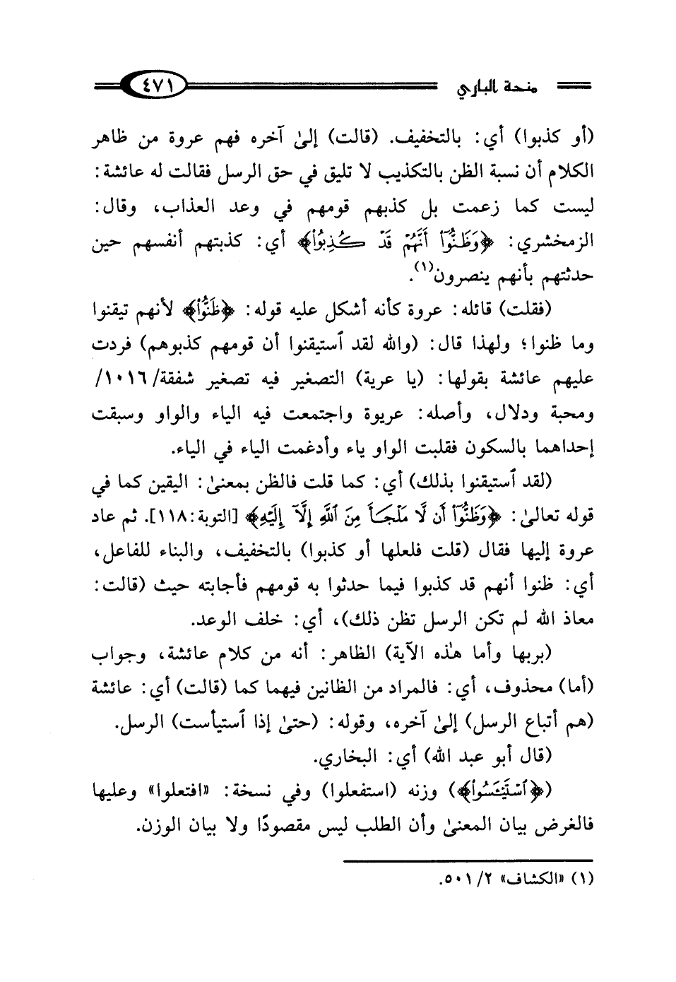 (لقد استيقنوا بذلك) أي: كما قلت فالظن بمعنى: اليقين كما في قوله تعالى: {وَظَنُّوا أَنْ لَا مَلْجَأَ مِنَ اللَّهِ إلا إِلَيْهِ} [التوبة: 118]. ثم عاد عروة إليها فقال (قلت فلعلها أو كذبوا) بالتخفيف، والبناء للفاعل، أي: ظنوا أنهم قد كذبوا فيما حدثوا به قومهم فأجابته حيث (قالت: معاذ اللَّه لم تكن الرسل تظن ذلك)، أي: خلف الوعد.