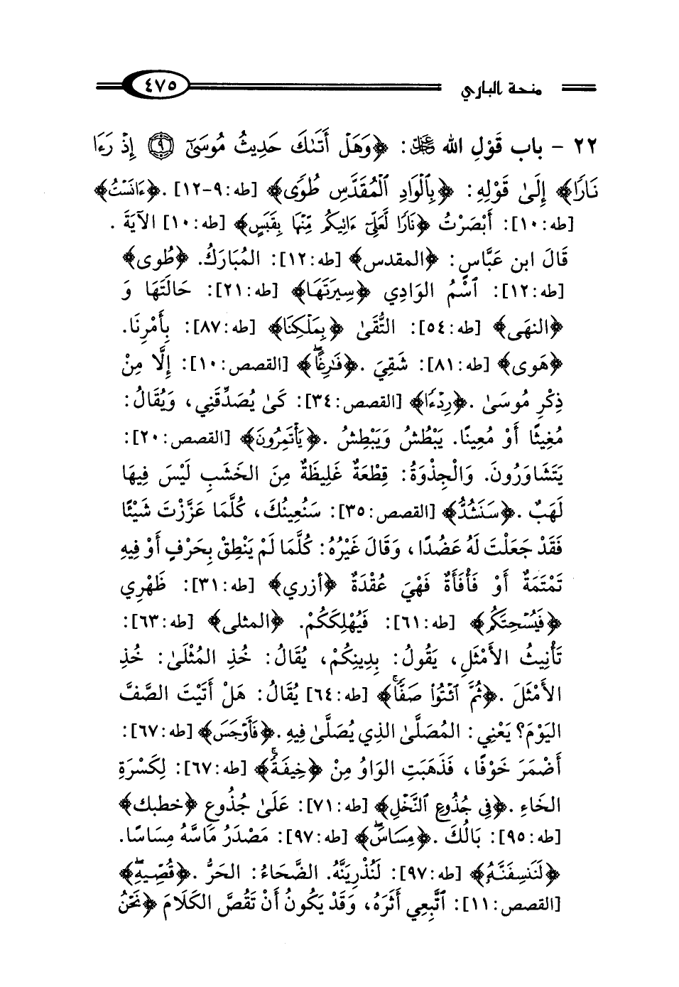 {آنَسْتُ} [طه: 10]: أَبْصَرْتُ، {نَارًا لَعَلِّي آتِيكُمْ مِنْهَا بِقَبَسٍ} [طه: 10] الآيَةَ " قَال ابْنُ عَبَّاسٍ المُقَدَّسُ: "المُبَارَكُ"، طُوًى: "اسْمُ الوَادِي"، {سِيرَتَهَا} [طه: 21]: "حَالتَهَا وَالنُّهَى التُّقَى"، {بِمَلْكِنَا} [طه: 87]: "بِأَمْرِنَا"، {هَوَى} [طه: 81]: "شَقِيَ"، {فَارِغًا} [القصص: 10]: "إلا مِنْ ذِكْرِ مُوسَى"، {رِدْءًا} [القصص: 34]: "كَيْ يُصَدِّقَنِي، وَيُقَالُ: مُغِيثًا أَوْ مُعِينًا، يَبْطُشُ وَيَبْطِشُ"، {يَأْتَمِرُونَ} [القصص: 20]: "يَتَشَاوَرُونَ، وَالجِذْوَةُ قِطْعَةٌ غَلِيظَةٌ مِنَ الخَشَبِ لَيْسَ فِيهَا لَهَبٌ". {سَنَشُدُّ} [القصص: 35]: "سَنُعِينُكَ، كُلَّمَا عَزَّزْتَ شَيْئًا فَقَدْ جَعَلْتَ لَهُ عَضُدًا" وَقَال غَيْرُهُ: كُلَّمَا لَمْ يَنْطِقْ بِحَرْفٍ أَوْ فِيهِ تَمْتَمَةٌ أَوْ فَأْفَأَةٌ فَهِيَ عُقْدَةٌ، {أَزْرِي} [طه: 31]: ظَهْرِي {فَيُسْحِتَكُمْ} [طه: 61]: فَيُهْلِكَكُمْ، {المُثْلَى} [طه: 63]: تَأْنِيثُ الأَمْثَلِ، يَقُولُ: بِدِينِكُمْ، يُقَالُ: خُذِ المُثْلَى خُذِ الأَمْثَلَ، {ثُمَّ ائْتُوا صَفًّا} [طه: 64]، يُقَالُ: هَلْ أَتَيْتَ الصَّفَّ اليَوْمَ، يَعْنِي المُصَلَّى الَّذِي يُصَلَّى فِيهِ، {فَأَوْجَسَ} [طه: 67]: أَضْمَرَ خَوْفًا، فَذَهَبَتِ الوَاوُ مِنْ {خِيفَةً} [هود: 70] لِكَسْرَةِ الخَاءِ. {فِي جُذُوعِ النَّخْلِ} [طه: 71]: عَلَى جُذُوعِ، {خَطْبُكَ} [طه: 95]: بَالُكَ. {مِسَاسَ} [طه: 97]: مَصْدَرُ مَاسَّهُ مِسَاسًا. {لَنَنْسِفَنَّهُ} [طه: 97]: لَنُذْرِيَنَّهُ. الضَّحَاءُ الحَرُّ. {قُصِّيهِ} [القصص: 11]: اتَّبِعِي أَثَرَهُ، وَقَدْ يَكُونُ أَنْ تَقُصَّ الكَلامَ. {نَحْنُ
