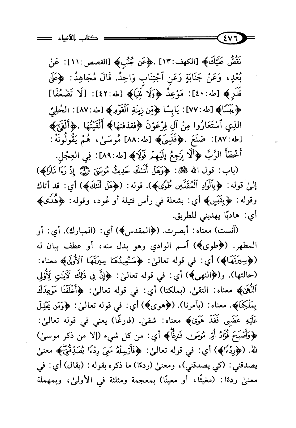 (آنست) معناه: أبصرت. ({الْمُقَدَّسِ}) أي: (المبارك). أي: أو المطهر. {طُوًى} اسم الوادي وهو بدل منه، أو عطف بيان له ({سِيرَتَهَا}) أي: في قوله تعالى: {سَنُعِيدُهَا سِيرَتَهَا الْأُولَى} معناه: (حالتها). و ({النُّهَى}) أي: في قوله تعالى: {إِنَّ فِي ذَلِكَ لآيَاتٍ لِأُولِي النُّهَى} معناه: التقى. (بملكنا) أي: في قوله تعالى: {أَخْلَفْنَا مَوْعِدَكَ بِمَلْكِنَا}. معناه: (بأمرنا). ({هَوَى}) أي: في قوله تعالى: {وَمَنْ يَحْلِلْ عَلَيْهِ غَضَبِي فَقَدْ هَوَى} معناه: شقى. ({فَارِغًا}) يعني في قوله تعالى: {وَأَصْبَحَ فُؤَادُ أُمِّ مُوسَى فَارِغًا} أي: من كل شيء (إلا من ذكر موسى) للَّه. ({رِدْءًا}) أي: في قوله تعالى: {فَأَرْسِلْهُ مَعِيَ رِدْءًا يُصَدِّقُنِي} معنى يصدقني: (كي يصدقني)، ومعنى (ردءًا) ما ذكره بقوله: (يقال) أي: في معنى ردءًا: (مغيثًا، أو معينًا) بمعجمة ومثلثة في الأولى، وبمهملة