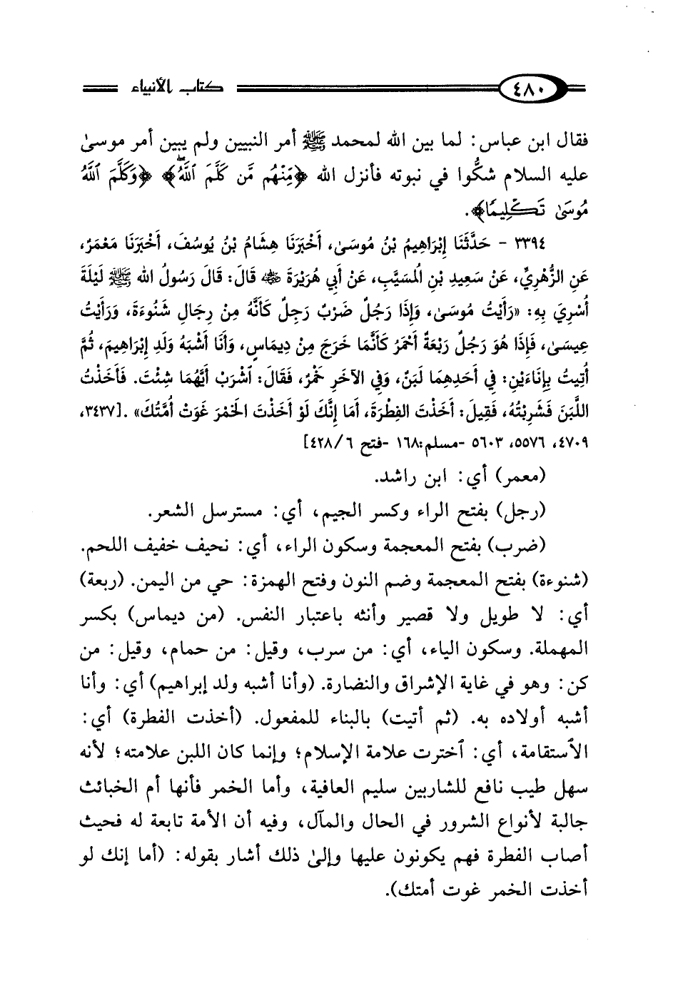 3394 - حَدَّثَنَا إِبْرَاهِيمُ بْنُ مُوسَى، أَخْبَرَنَا هِشَامُ بْنُ يُوسُفَ، أَخْبَرَنَا مَعْمَرٌ، عَنِ الزُّهْرِيِّ، عَنْ سَعِيدِ بْنِ المُسَيِّبِ، عَنْ أَبِي هُرَيْرَةَ رَضِيَ اللَّهُ عَنْهُ، قَال: قَال رَسُولُ اللَّهِ صَلَّى اللهُ عَلَيْهِ وَسَلَّمَ لَيْلَةَ أُسْرِيَ بِي: "رَأَيْتُ مُوسَى: وَإِذَا هُوَ رَجُلٌ ضَرْبٌ رَجِلٌ، كَأَنَّهُ مِنْ رِجَالِ شَنُوءَةَ، وَرَأَيْتُ عِيسَى، فَإِذَا هُوَ رَجُلٌ رَبْعَةٌ أَحْمَرُ، كَأَنَّمَا خَرَجَ مِنْ دِيمَاسٍ، وَأَنَا أَشْبَهُ وَلَدِ إِبْرَاهِيمَ صَلَّى اللهُ عَلَيْهِ وَسَلَّمَ بِهِ، ثُمَّ أُتِيتُ بِإِنَاءَيْنِ: فِي أَحَدِهِمَا لَبَنٌ وَفِي الآخَرِ خَمْرٌ، فَقَال: اشْرَبْ أَيَّهُمَا شِئْتَ، فَأَخَذْتُ اللَّبَنَ فَشَرِبْتُهُ، فَقِيلَ: أَخَذْتَ الفِطْرَةَ أَمَا إِنَّكَ لَوْ أَخَذْتَ الخَمْرَ غَوَتْ أُمَّتُكَ".