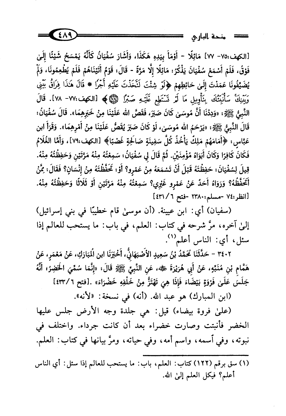 [الكهف: 75 - 77] مَائِلًا، أَوْمَأَ بِيَدِهِ هَكَذَا، - وَأَشَارَ سُفْيَانُ كَأَنَّهُ يَمْسَحُ شَيْئًا إِلَى فَوْقُ، فَلَمْ أَسْمَعْ سُفْيَانَ يَذْكُرُ مَائِلًا إلا مَرَّةً -، قَال: قَوْمٌ أَتَيْنَاهُمْ فَلَمْ يُطْعِمُونَا وَلَمْ يُضَيِّفُونَا، عَمَدْتَ إِلَى حَائِطِهِمْ، لَوْ شِئْتَ لاتَّخَذْتَ عَلَيْهِ أَجْرًا، قَال: هَذَا فِرَاقُ بَيْنِي وَبَيْنِكَ، سَأُنَبِّئُكَ بِتَأْويلِ مَا لَمْ تَسْتَطِعْ عَلَيْهِ صَبْرًا، قَال النَّبِيُّ صَلَّى اللهُ عَلَيْهِ وَسَلَّمَ: وَدِدْنَا أَنَّ مُوسَى كَانَ صَبَرَ فَقَصَّ اللَّهُ عَلَيْنَا مِنْ خَبَرِهِمَا، - قَال سُفْيَانُ -، قَال النَّبِيُّ صَلَّى اللهُ عَلَيْهِ وَسَلَّمَ "يَرْحَمُ اللَّهُ مُوسَى لَوْ كَانَ صَبَرَ لَقُصَّ عَلَيْنَا مِنْ أَمْرِهِمَا" وَقَرَأَ ابْنُ عَبَّاسٍ: "أَمَامَهُمْ مَلِكٌ يَأْخُذُ كُلَّ سَفِينَةٍ صَالِحَةٍ غَصْبًا" وَأَمَّا الغُلامُ فَكَانَ كَافِرًا وَكَانَ أَبَوَاهُ مُؤْمِنَيْنِ " ثُمَّ قَال لِي سُفْيَانُ: سَمِعْتُهُ مِنْهُ مَرَّتَيْنِ، وَحَفِظْتُهُ مِنْهُ، قِيلَ لِسُفْيَانَ: حَفِظْتَهُ قَبْلَ أَنْ تَسْمَعَهُ مِنْ عَمْرٍو، أَوْ تَحَفَّظْتَهُ مِنْ إِنْسَانٍ؟، فَقَال: مِمَّنْ أَتَحَفَّظُهُ، وَرَوَاهُ أَحَدٌ، عَنْ عَمْرٍو غَيْرِي سَمِعْتُهُ مِنْهُ مَرَّتَيْنِ، أَوْ ثَلاثًا وَحَفِظْتُهُ مِنْهُ".