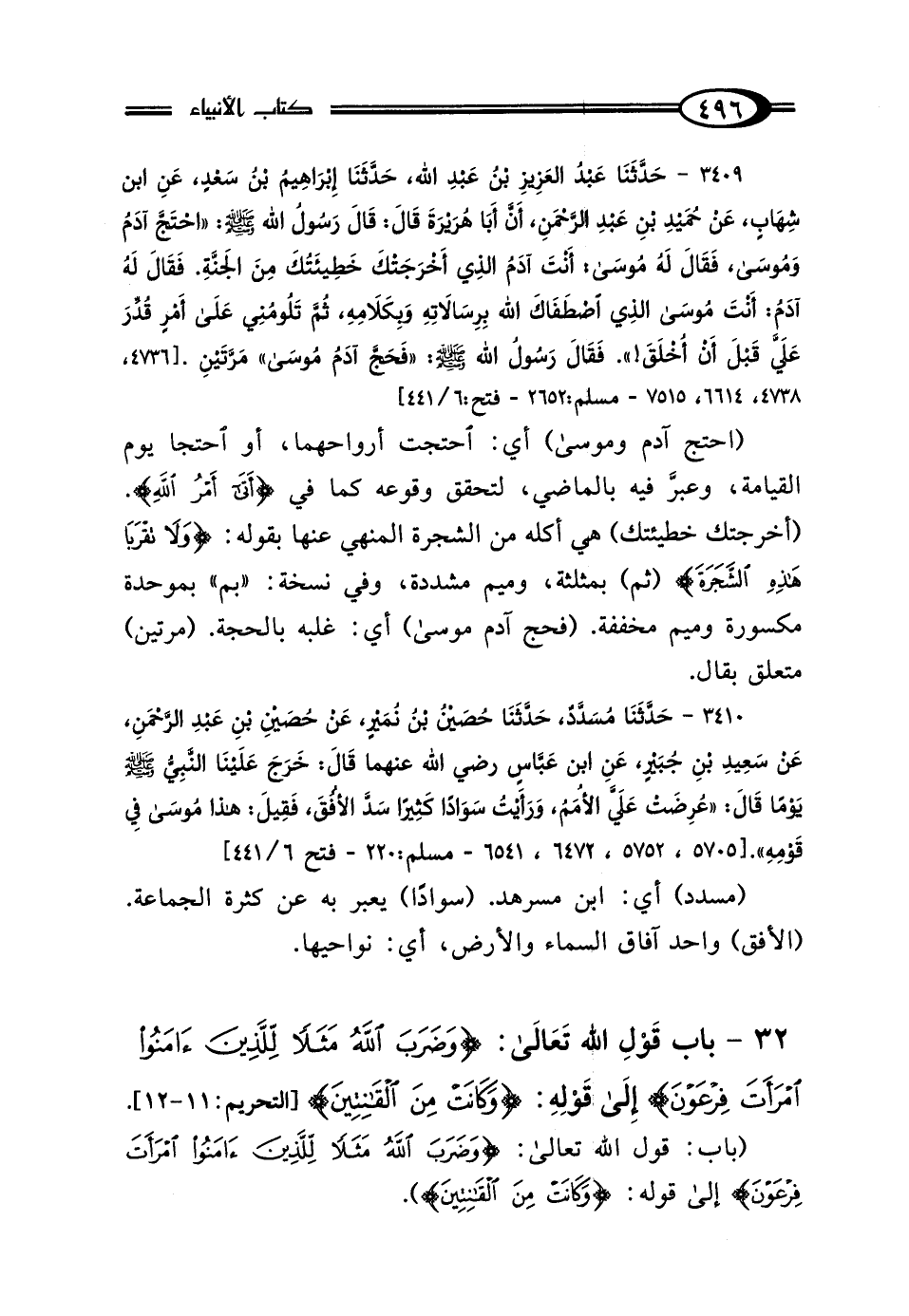 3409 - حَدَّثَنَا عَبْدُ العَزِيزِ بْنُ عَبْدِ اللَّهِ، حَدَّثَنَا إِبْرَاهِيمُ بْنُ سَعْدٍ، عَنِ ابْنِ شِهَابٍ، عَنْ حُمَيْدِ بْنِ عَبْدِ الرَّحْمَنِ، أَنَّ أَبَا هُرَيْرَةَ، قَال: قَال رَسُولُ اللَّهِ صَلَّى اللهُ عَلَيْهِ وَسَلَّمَ: "احْتَجَّ آدَمُ وَمُوسَى، فَقَال لَهُ مُوسَى: أَنْتَ آدَمُ الَّذِي أَخْرَجَتْكَ خَطِيئَتُكَ مِنَ الجَنَّةِ، فَقَال لَهُ آدَمُ: أَنْتَ مُوسَى الَّذِي اصْطَفَاكَ اللَّهُ بِرِسَالاتِهِ وَبِكَلامِهِ، ثُمَّ تَلُومُنِي عَلَى أَمْرٍ قُدِّرَ عَلَيَّ قَبْلَ أَنْ أُخْلَقَ " فَقَال رَسُولُ اللَّهِ صَلَّى اللهُ عَلَيْهِ وَسَلَّمَ: "فَحَجَّ آدَمُ مُوسَى مَرَّتَيْنِ".