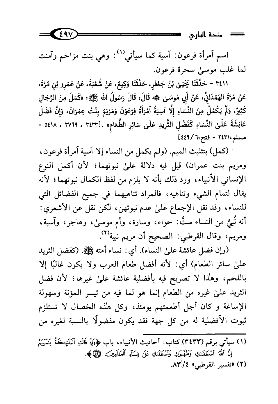 3411 - حَدَّثَنَا يَحْيَى بْنُ جَعْفَرٍ، حَدَّثَنَا وَكِيعٌ، عَنْ شُعْبَةَ، عَنْ عَمْرِو بْنِ مُرَّةَ، عَنْ مُرَّةَ الهَمْدَانِيِّ، عَنْ أَبِي مُوسَى رَضِيَ اللَّهُ عَنْهُ، قَال: قَال رَسُولُ اللَّهِ صَلَّى اللهُ عَلَيْهِ وَسَلَّمَ: "كَمَلَ مِنَ الرِّجَالِ كَثِيرٌ، وَلَمْ يَكْمُلْ مِنَ النِّسَاءِ: إلا آسِيَةُ امْرَأَةُ فِرْعَوْنَ، وَمَرْيَمُ بِنْتُ عِمْرَانَ، وَإِنَّ فَضْلَ عَائِشَةَ عَلَى النِّسَاءِ كَفَضْلِ الثَّرِيدِ عَلَى سَائِرِ الطَّعَامِ".