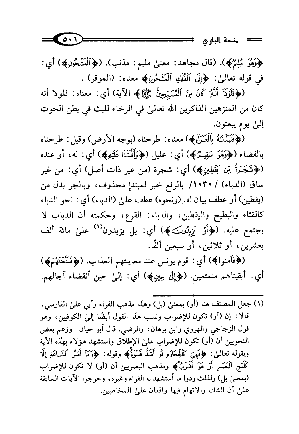 ({فَنَبَذْنَاهُ بِالْعَرَاءِ}) معناه: طرحناه (بوجه الأرض) وقيل: طرحناه بالفضاء ({وَهُوَ سَقِيمٌ}) أي: عليل ({وَأَنْبَتْنَا عَلَيْهِ}) أي: له، أو عنده ({شَجَرَةً مِنْ يَقْطِينٍ}) أي: شجرة (من غير ذات أصل) أي: من غير ساق (الدباء) بالرفع خبر لمبتدأ محذوف، وبالجر بدل من (يقطين) أو عطف بيان له. (ونحوه) عطف على (الدباء) أي: نحو الدباء كالقثاء والبطيخ واليقطين، والدباء: القرع، وحكمته أن الذباب لا يجتمع عليه. ({أَوْ يَزِيدُونَ}) أي: بل يزيدون (¬1) على مائة ألف بعشرين، أو ثلاثين، أو سبعين ألفًا.
