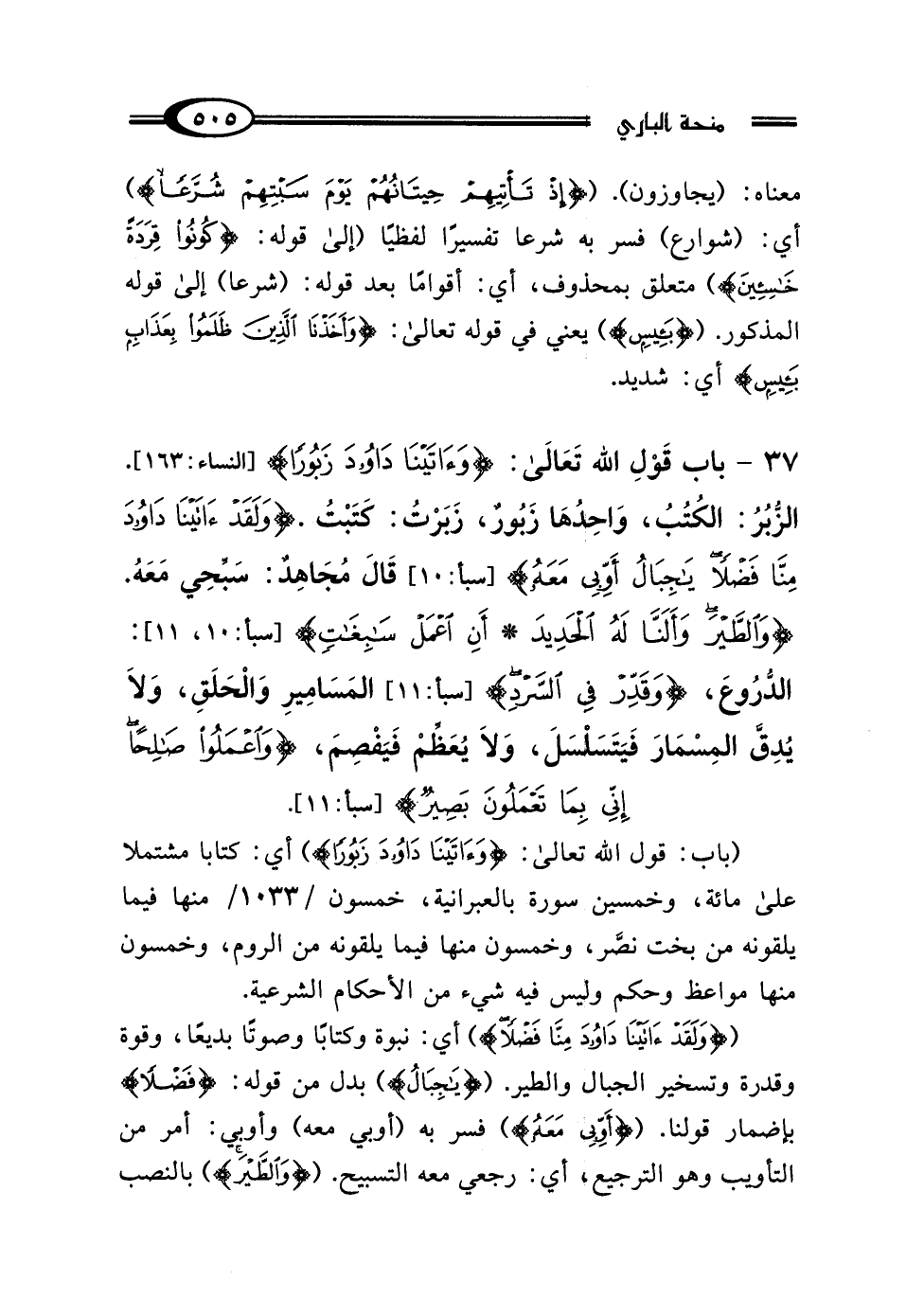 الزُّبُرُ: الكُتُبُ، وَاحِدُهَا زَبُورٌ، زَبَرْتُ كَتَبْتُ، {وَلَقَدْ آتَيْنَا دَاوُدَ مِنَّا فَضْلًا يَا جِبَالُ أَوِّبِي مَعَهُ} " قَال مُجَاهِدٌ: "سَبِّحِي مَعَهُ {وَالطَّيْرَ وَأَلَنَّا لَهُ الحَدِيدَ أَنِ اعْمَلْ سَابِغَاتٍ} [سبأ: 11] الدُّرُوعَ، {وَقَدِّرْ فِي السَّرْدِ} [سبأ: 11] المَسَامِيرِ وَالحَلَقِ، وَلَا يُدِقَّ المِسْمَارَ فَيَتَسَلْسَلَ، وَلَا يُعَظِّمْ فَيَفْصِمَ {وَاعْمَلُوا صَالِحًا إِنِّي بِمَا تَعْمَلُونَ بَصِيرٌ} [سبأ: 11].