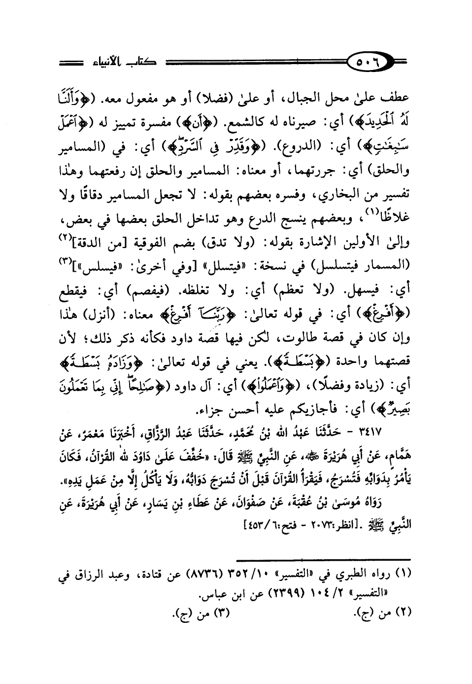 عطف على محل الجبال، أو على (فضلا) أو هو مفعول معه. ({وَأَلَنَّا لَهُ الْحَدِيدَ}) أي: صيرناه له كالشمع. ({أَنِ}) مفسرة تمييز له ({اعْمَلْ سَابِغَاتٍ}) أي: (الدروع). ({وَقَدِّرْ فِي السَّرْدِ}) أي: في (المسامير والحلق) أي: جررتهما، أو معناه: المسامير والحلق إن رفعتهما وهذا تفسير من البخاري، وفسره بعضهم بقوله: لا تجعل المسامير دقاقًا ولا غلاظًا (¬1)، وبعضهم ينسج الدرع وهو تداخل الحلق بعضها في بعض، وإلى الأولين الإشارة بقوله: (ولا تدق) بضم الفوقية [من الدقة] (¬2) (المسمار فيتسلسل) في نسخة: "فيتسلل" [وفي أخرى: "فيسلس"] (¬3) أي: فيسهل. (ولا تعظم) أي: ولا تغلظه. (فيفصم) أي: فيقطع ({أَفْرِغْ}) أي: في قوله تعالى: {رَبَّنَا أَفْرِغْ} معناه: (أنزل) هذا وإن كان في قصة طالوت، لكن فيها قصة داود فكأنه ذكر ذلك؛ لأن قصتهما واحدة ({بَسْطَةً}). يعني في قوله تعالى: {وَزَادَهُ بَسْطَةً} أي: (زيادة وفضلًا)، ({وَاعْمَلُوا}) أي: آل داود ({صَالِحًا إِنِّي بِمَا تَعْمَلُونَ بَصِيرٌ}) أي: فأجازيكم عليه أحسن جزاء.