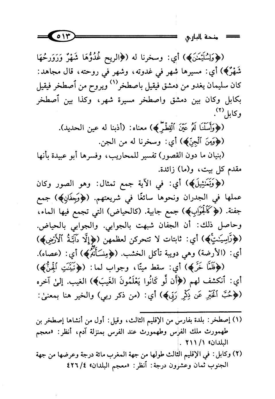 ({وَتَمَاثِيلَ}) أي: في الآية جمع تمثال: وهو الصور وكان عملها في الجدران ونحوها سائغًا في شريعتهم. ({وَجِفَانٍ}) جمع جفنة. ({كَالْجَوَابِ}) جمع جابية. (كالحياض) التي تجمع فيها الماء، وحاصل ذلك: أن الجفان شبهت بالجوابي. والجوابي بالحياض. ({رَاسِيَاتٍ}) أي: ثابتات لا تتحركن لعظمهن ({إلا دَابَّةُ الْأَرْضِ}) أي: (الأرضة) وهي دويبة تأكل الخشب. ({مِنْسَأَتَهُ}) أي: (عصاه). ({فَلَمَّا خَرَّ}) أي: سقط ميتًا، وجواب لما: ({تَبَيَّنَتِ الْجِنُّ}) أي: انكشف لهم ({أَنْ لَوْ كَانُوا يَعْلَمُونَ الْغَيْبَ}) الغيب. إلى آخره ({حُبَّ الْخَيْرِ عَنْ ذِكْرِ رَبِّي}) أي: (من ذكر ربي) والخير هنا بمعنى: