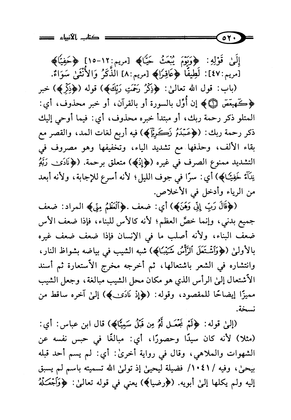 (باب: قول اللَّه تعالى: {ذِكْرُ رَحْمَتِ رَبِّكَ}) قوله ({ذِكْرُ}) خبر {كهيعص (1)} إن أُوِّل بالسورة أو بالقرآن، أو خبر محذوف، أي: المتلو ذكر رحمة ربك، أو مبتدأ خبره محذوف، أي: فيما أوحي إليك ذكر رحمة ربك: ({عَبْدَهُ زَكَرِيَّا}) فيه أربع لغات المد، والقصر مع بقاء الألف، وحذفها مع تشديد الياء، وتخفيفها وهو مصروف في التشديد ممنوع الصرف في غيره ({إِذْ}) متعلق برحمة. ({نَادَى رَبَّهُ نِدَاءً خَفِيًّا}) أي: سرًّا في جوف الليل؛ لأنه أسرع للإجابة، ولأنه أبعد من الرياء وأدخل في الإخلاص.