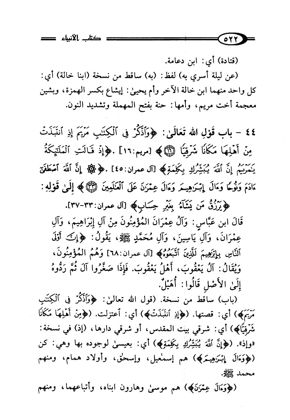 (باب) ساقط من نسخة. (قول اللَّه تعالى: {وَاذْكُرْ فِي الْكِتَابِ مَرْيَمَ}) أي: قصتها. ({إِذِ انْتَبَذَتْ}) أي: اعتزلت. ({مِنْ أَهْلِهَا مَكَانًا شَرْقِيًّا}) أي: شرقي بيت المقدس، أو شرقي دارها، (إذ) في نسخة: "وإذ". ({إِنَّ اللَّهَ يُبَشِّرُكِ بِكَلِمَةٍ}) أي: بعيسى لوجوده بها وهي: كن ({وَآلَ إِبْرَاهِيمَ}) هم إسماعيل، وإسحق، وأولاد همام، ومنهم محمد - صلى الله عليه وسلم -.