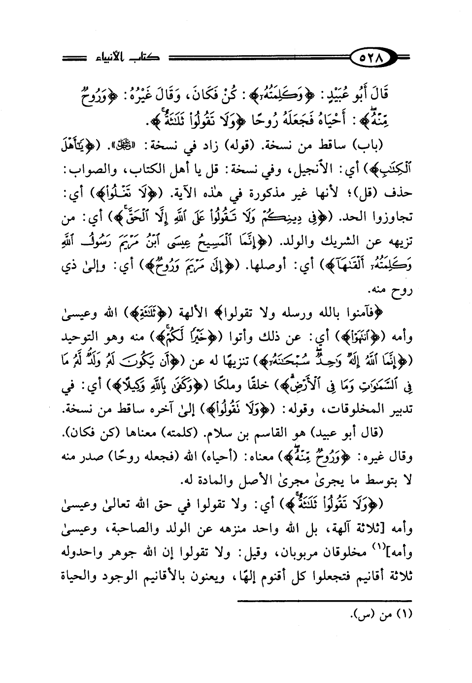قَال أَبُو عُبَيْدٍ {وَكَلِمَتُهُ}: كُنْ فَكَانَ، وَقَال غَيْرُهُ: {وَرُوحٌ مِنْهُ}: أَحْيَاهُ فَجَعَلَهُ رُوحًا، {وَلَا تَقُولُوا ثَلَاثَةٌ}.