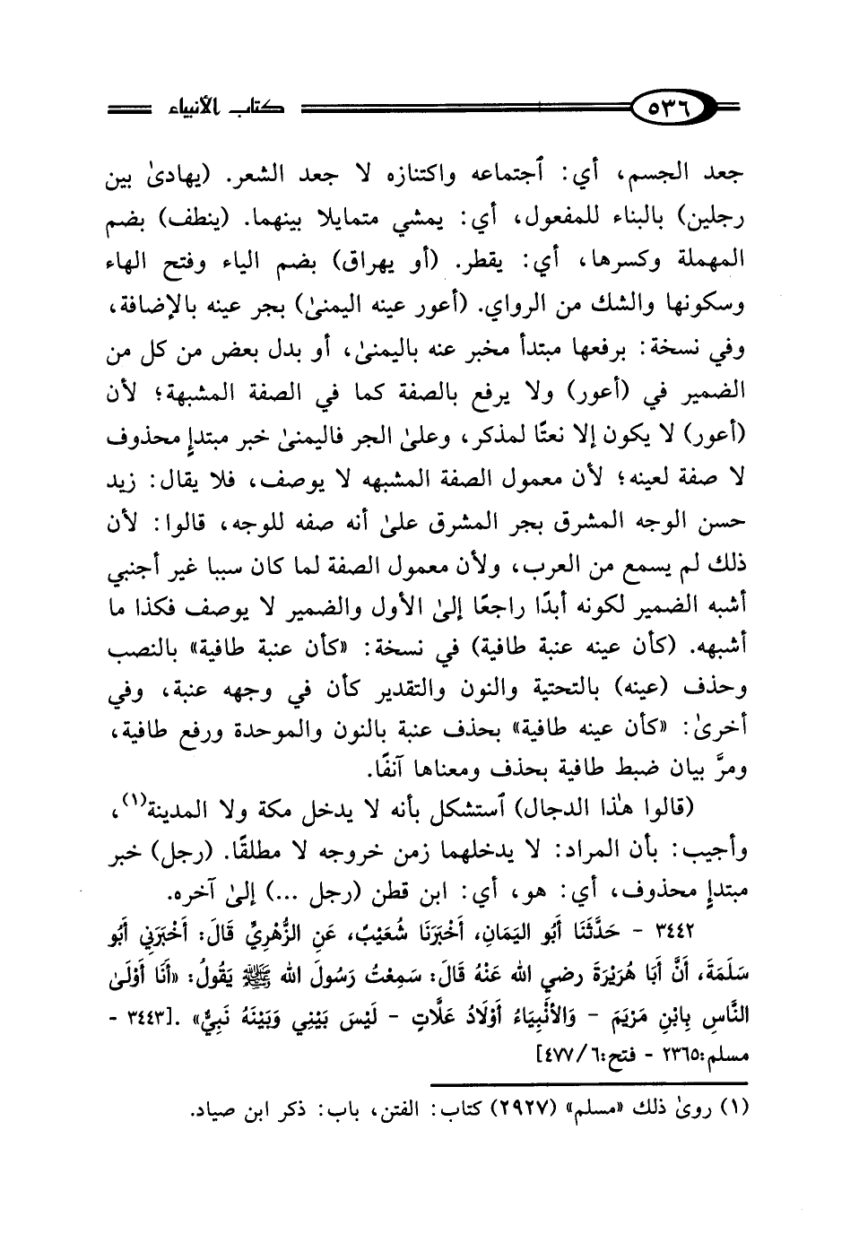 جعد الجسم، أي: اجتماعه واكتنازه لا جعد الشعر. (يهادى بين رجلين) بالبناء للمفعول، أي: يمشي متمايلا بينهما. (ينطف) بضم المهملة وكسرها، أي: يقطر. (أو يهراق) بضم الياء وفتح الهاء وسكونها والشك من الرواي. (أعور عينه اليمنى) بجر عينه بالإضافة، وفي نسخة: برفعها مبتدأ مخبر عنه باليمنى، أو بدل بعض من كل من الضمير في (أعور) ولا يرفع بالصفة كما في الصفة المشبهة؛ لأن (أعور) لا يكون إلا نعتًا لمذكر، وعلى الجر فاليمنى خبر مبتدإٍ محذوف لا صفة لعينه؛ لأن معمول الصفة المشبهه لا يوصف، فلا يقال: زيد حسن الوجه المشرق بجر المشرق على أنه صفه للوجه، قالوا: لأن ذلك لم يسمع من العرب، ولأن معمول الصفة لما كان سببا غير أجنبي أشبه الضمير لكونه أبدًا راجعًا إلى الأول والضمير لا يوصف فكذا ما أشبهه. (كأن عينه عنبة طافية) في نسخة: "كأن عنبة طافية" بالنصب وحذف (عينه) بالتحتية والنون والتقدير كان في وجهه عنبة، وفي أخرى: "كأن عينه طافية" بحذف عنبة بالنون والموحدة ورفع طافية، ومرَّ بيان ضبط طافية بحذف ومعناها آنفًا.