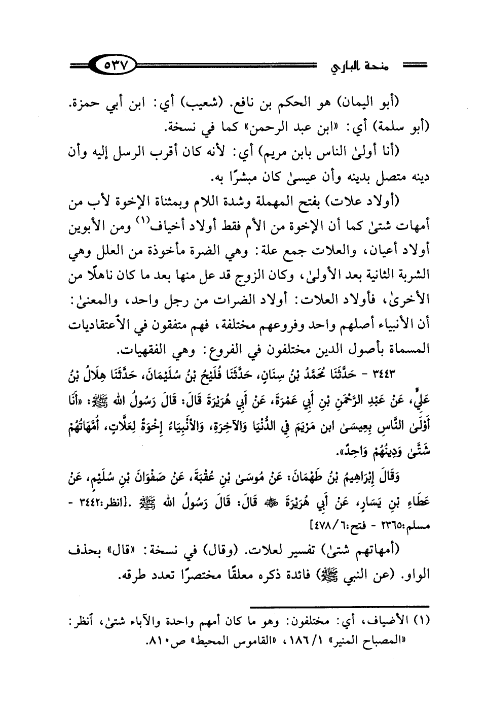 (أولاد علات) بفتح المهملة وشدة اللام وبمثناة الإخوة لأب من أمهات شتى كما أن الإخوة من الأم فقط أولاد أخياف (¬1) ومن الأبوين أولاد أعيان، والعلات جمع علة: وهي الضرة مأخوذة من العلل وهي الشربة الثانية بعد الأولى، وكان الزوج قد عل منها بعد ما كان ناهلًا من الأخرى، فأولاد العلات: أولاد الضرات من رجل واحد، والمعنى: أن الأنبياء أصلهم واحد وفروعهم مختلفة، فهم متفقون في الاعتقاديات المسماة بأصول الدين مختلفون في الفروع: وهي الفقهيات.