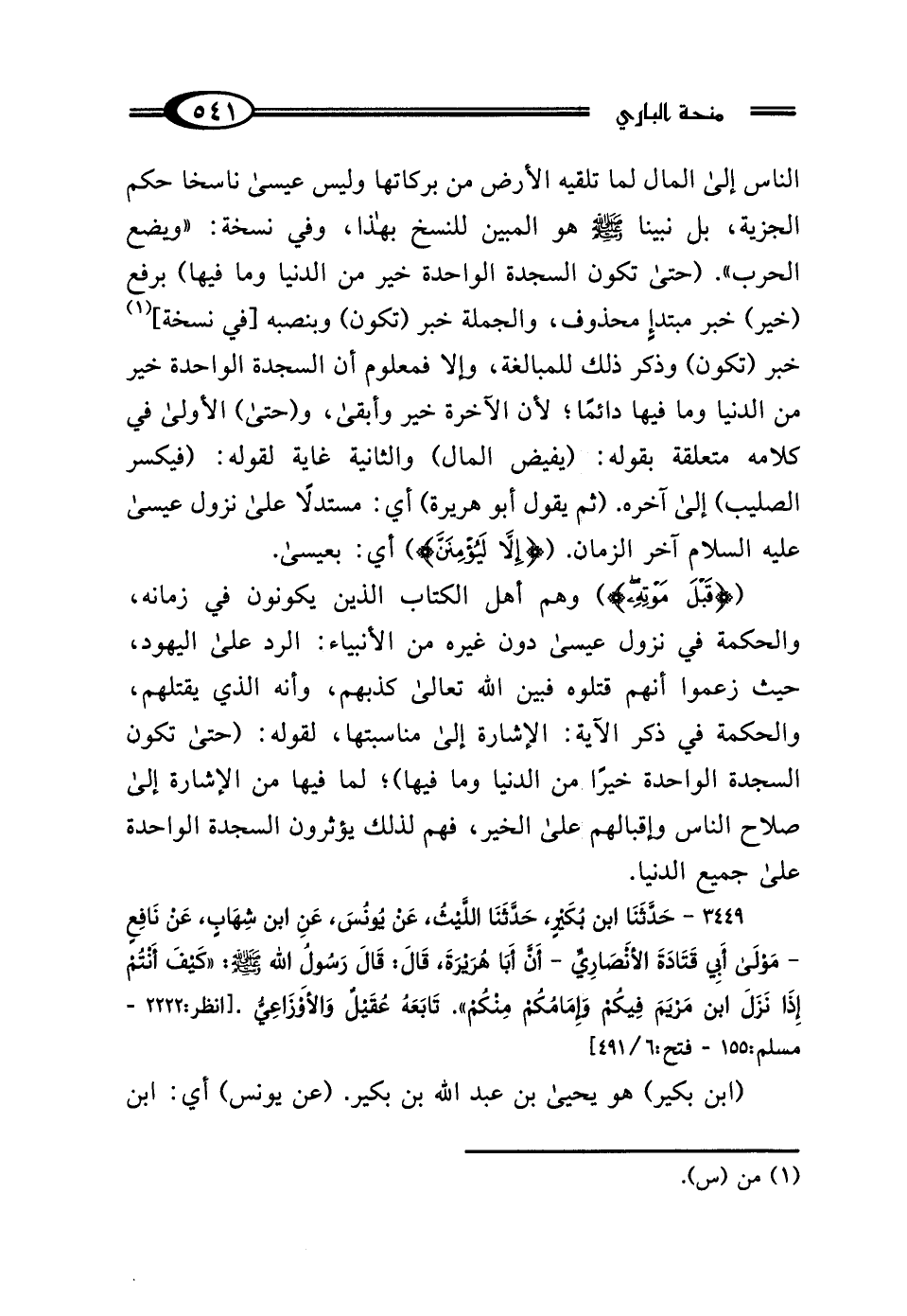 الناس إلى المال لما تلفيه الأرض من بركاتها وليس عيسى ناسخا حكم الجزية، بل نبينا - صلى اللَّه عليه وسلم -هو المبين للنسخ بهذا، وفي نسخة: "ويضع الحرب". (حتى تكون السجدة الواحدة خير من الدنيا وما فيها) برفع (خير) خبر مبتدإٍ محذوف، والجملة خبر (تكون) وبنصبه [في نسخة] (¬1) خبر (تكون) وذكر ذلك للمبالغة، وإلا فمعلوم أن السجدة الواحدة خير من الدنيا وما فيها دائمًا؛ لأن الآخرة خير وأبقى، و (حتى) الأولى في كلامه متعلقة بقوله: (يفيض المال) والثانية غاية لقوله: (فيكسر الصليب) إلى آخره. (ثم يقول أبو هريرة) أي: مستدلًا على نزول عيسى - عليه السلام - آخر الزمان. ({إلا لَيُؤْمِنَنَّ}) أي: بعيسى.