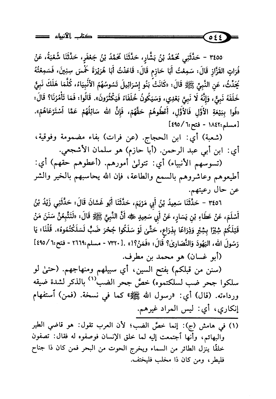 3456 - حَدَّثَنَا سَعِيدُ بْنُ أَبِي مَرْيَمَ، حَدَّثَنَا أَبُو غَسَّانَ، قَال: حَدَّثَنِي زَيْدُ بْنُ أَسْلَمَ، عَنْ عَطَاءِ بْنِ يَسَارٍ، عَنْ أَبِي سَعِيدٍ رَضِيَ اللَّهُ عَنْهُ، أَنَّ النَّبِيَّ صَلَّى اللهُ عَلَيْهِ وَسَلَّمَ، قَال: "لَتَتَّبِعُنَّ سَنَنَ مَنْ قَبْلَكُمْ شِبْرًا بِشِبْرٍ، وَذِرَاعًا بِذِرَاعٍ، حَتَّى لَوْ سَلَكُوا جُحْرَ ضَبٍّ لَسَلَكْتُمُوهُ"، قُلْنَا يَا رَسُولَ اللَّهِ: اليَهُودَ، وَالنَّصَارَى قَال: "فَمَنْ؟! ".