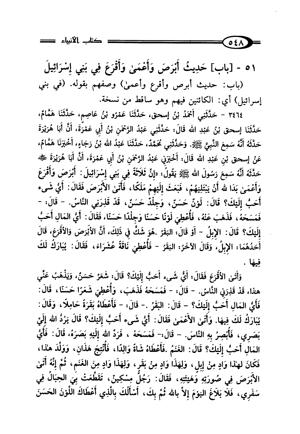 3464 - حَدَّثَنِي أَحْمَدُ بْنُ إِسْحَاقَ، حَدَّثَنَا عَمْرُو بْنُ عَاصِمٍ، حَدَّثَنَا هَمَّامٌ، حَدَّثَنَا إِسْحَاقُ بْنُ عَبْدِ اللَّهِ، قَال: حَدَّثَنِي عَبْدُ الرَّحْمَنِ بْنُ أَبِي عَمْرَةَ، أَنَّ أَبَا هُرَيْرَةَ، حَدَّثَهُ: أَنَّهُ سَمِعَ النَّبِيَّ صَلَّى اللهُ عَلَيْهِ وَسَلَّمَ، ح وحَدَّثَنِي مُحَمَّدٌ، حَدَّثَنَا عَبْدُ اللَّهِ بْنُ رَجَاءٍ، أَخْبَرَنَا هَمَّامٌ، عَنْ إِسْحَاقَ بْنِ عَبْدِ اللَّهِ، قَال: أَخْبَرَنِي عَبْدُ الرَّحْمَنِ بْنُ أَبِي عَمْرَةَ، أَنَّ أَبَا هُرَيْرَةَ رَضِيَ اللَّهُ عَنْهُ، حَدَّثَهُ: أَنَّهُ سَمِعَ رَسُولَ اللَّهِ صَلَّى اللهُ عَلَيْهِ وَسَلَّمَ، يَقُولُ: "إِنَّ ثَلاثَةً فِي بَنِي إِسْرَائِيلَ: أَبْرَصَ وَأَقْرَعَ وَأَعْمَى، بَدَا لِلَّهِ عَزَّ وَجَلَّ أَنْ يَبْتَلِيَهُمْ، فَبَعَثَ إِلَيْهِمْ مَلَكًا، فَأَتَى الأَبْرَصَ، فَقَال: أَيُّ شَيْءٍ أَحَبُّ إِلَيْكَ؟ قَال: لَوْنٌ حَسَنٌ، وَجِلْدٌ حَسَنٌ، قَدْ قَذِرَنِي النَّاسُ، قَال: فَمَسَحَهُ فَذَهَبَ عَنْهُ، فَأُعْطِيَ لَوْنًا حَسَنًا، وَجِلْدًا حَسَنًا، فَقَال: أَيُّ المَالِ أَحَبُّ إِلَيْكَ؟ قَال: الإِبِلُ، - أَوْ قَال: البَقَرُ، هُوَ شَكَّ فِي ذَلِكَ: إِنَّ الأَبْرَصَ، وَالأَقْرَعَ، قَال أَحَدُهُمَا الإِبِلُ، وَقَال الآخَرُ: البَقَرُ -، فَأُعْطِيَ نَاقَةً عُشَرَاءَ، فَقَال: يُبَارَكُ لَكَ فِيهَا وَأَتَى الأَقْرَعَ فَقَال: أَيُّ شَيْءٍ أَحَبُّ إِلَيْكَ؟ قَال شَعَرٌ حَسَنٌ، وَيَذْهَبُ عَنِّي هَذَا، قَدْ قَذِرَنِي النَّاسُ، قَال: فَمَسَحَهُ فَذَهَبَ وَأُعْطِيَ شَعَرًا حَسَنًا، قَال: فَأَيُّ المَالِ أَحَبُّ إِلَيْكَ؟ قَال: البَقَرُ، قَال: فَأَعْطَاهُ بَقَرَةً حَامِلًا، وَقَال: يُبَارَكُ لَكَ فِيهَا، وَأَتَى الأَعْمَى فَقَال: أَيُّ شَيْءٍ أَحَبُّ إِلَيْكَ؟ قَال: يَرُدُّ اللَّهُ إِلَيَّ بَصَرِي، فَأُبْصِرُ بِهِ النَّاسَ، قَال: فَمَسَحَهُ فَرَدَّ اللَّهُ إِلَيْهِ بَصَرَهُ، قَال: فَأَيُّ المَالِ أَحَبُّ إِلَيْكَ؟ قَال الغَنَمُ: فَأَعْطَاهُ شَاةً وَالِدًا، فَأُنْتِجَ هَذَانِ وَوَلَّدَ هَذَا، فَكَانَ لِهَذَا وَادٍ مِنْ إِبِلٍ، وَلِهَذَا وَادٍ مِنْ بَقَرٍ، وَلِهَذَا وَادٍ مِنْ غَنَمٍ، ثُمَّ إِنَّهُ أَتَى الأَبْرَصَ فِي صُورَتِهِ وَهَيْئَتِهِ، فَقَال رَجُلٌ مِسْكِينٌ، تَقَطَّعَتْ بِيَ الحِبَالُ فِي سَفَرِي، فَلَا بَلاغَ اليَوْمَ إلا بِاللَّهِ ثُمَّ بِكَ، أَسْأَلُكَ بِالَّذِي أَعْطَاكَ اللَّوْنَ الحَسَنَ،