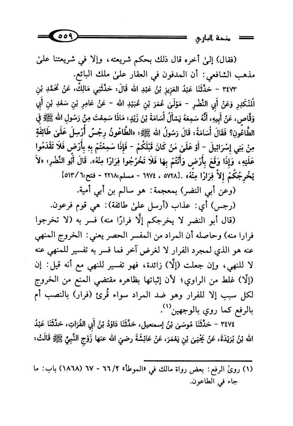 3473 - حَدَّثَنَا عَبْدُ العَزِيزِ بْنُ عَبْدِ اللَّهِ، قَال: حَدَّثَنِي مَالِكٌ، عَنْ مُحَمَّدِ بْنِ المُنْكَدِرِ، وَعَنْ أَبِي النَّضْرِ، مَوْلَى عُمَرَ بْنِ عُبَيْدِ اللَّهِ، عَنْ عَامِرِ بْنِ سَعْدِ بْنِ أَبِي وَقَّاصٍ، عَنْ أَبِيهِ، أَنَّهُ سَمِعَهُ يَسْأَلُ أُسَامَةَ بْنَ زَيْدٍ، مَاذَا سَمِعْتَ مِنْ رَسُولِ اللَّهِ صَلَّى اللهُ عَلَيْهِ وَسَلَّمَ فِي الطَّاعُونِ؟ فَقَال أُسَامَةُ: قَال رَسُولُ اللَّهِ صَلَّى اللهُ عَلَيْهِ وَسَلَّمَ: "الطَّاعُونُ رِجْسٌ أُرْسِلَ عَلَى طَائِفَةٍ مِنْ بَنِي إِسْرَائِيلَ، أَوْ عَلَى مَنْ كَانَ قَبْلَكُمْ، فَإِذَا سَمِعْتُمْ بِهِ بِأَرْضٍ، فَلَا تَقْدَمُوا عَلَيْهِ، وَإِذَا وَقَعَ بِأَرْضٍ، وَأَنْتُمْ بِهَا فَلَا تَخْرُجُوا، فِرَارًا مِنْهُ" قَال أَبُو النَّضْرِ: "لَا يُخْرِجْكُمْ إلا فِرَارًا مِنْهُ".