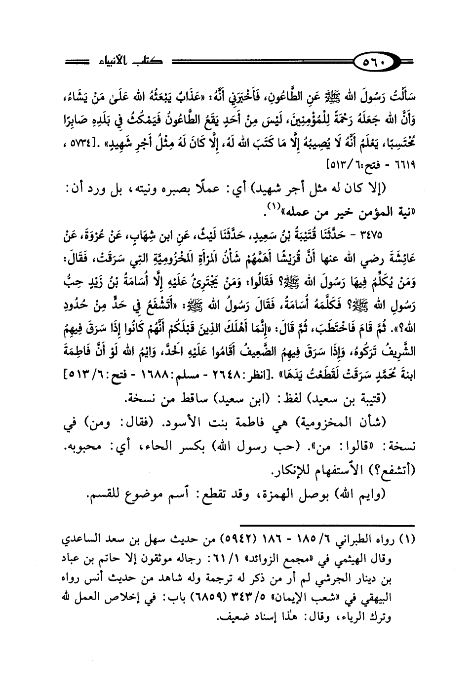 3475 - حَدَّثَنَا قُتَيْبَةُ بْنُ سَعِيدٍ، حَدَّثَنَا لَيْثٌ، عَنِ ابْنِ شِهَابٍ، عَنْ عُرْوَةَ، عَنْ عَائِشَةَ رَضِيَ اللَّهُ عَنْهَا، أَنَّ قُرَيْشًا أَهَمَّهُمْ شَأْنُ المَرْأَةِ المَخْزُومِيَّةِ الَّتِي سَرَقَتْ، فَقَالُوا: وَمَنْ يُكَلِّمُ فِيهَا رَسُولَ اللَّهِ صَلَّى اللهُ عَلَيْهِ وَسَلَّمَ؟ فَقَالُوا: وَمَنْ يَجْتَرِئُ عَلَيْهِ إلا أُسَامَةُ بْنُ زَيْدٍ، حِبُّ رَسُولِ اللَّهِ صَلَّى اللهُ عَلَيْهِ وَسَلَّمَ فَكَلَّمَهُ أُسَامَةُ، فَقَال رَسُولُ اللَّهِ صَلَّى اللهُ عَلَيْهِ وَسَلَّمَ: "أَتَشْفَعُ فِي حَدٍّ مِنْ حُدُودِ اللَّهِ، ثُمَّ قَامَ فَاخْتَطَبَ، ثُمَّ قَال: إِنَّمَا أَهْلَكَ الَّذِينَ قَبْلَكُمْ، أَنَّهُمْ كَانُوا إِذَا سَرَقَ فِيهِمُ الشَّرِيفُ تَرَكُوهُ، وَإِذَا سَرَقَ فِيهِمُ الضَّعِيفُ أَقَامُوا عَلَيْهِ الحَدَّ، وَايْمُ اللَّهِ لَوْ أَنَّ فَاطِمَةَ بِنْتَ مُحَمَّدٍ سَرَقَتْ لَقَطَعْتُ يَدَهَا".