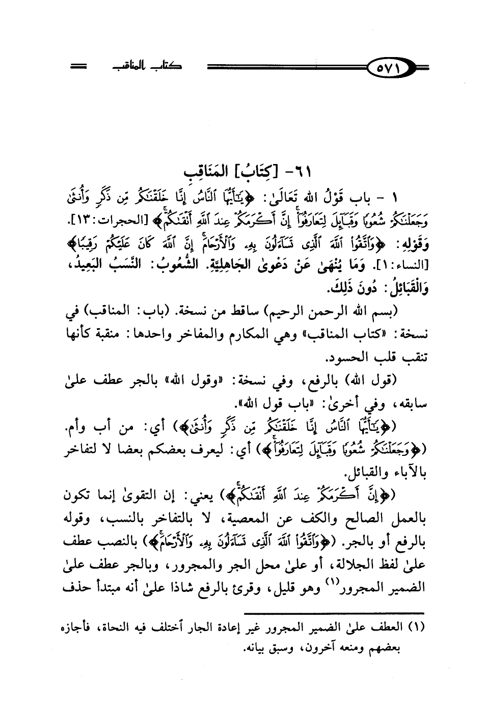1 - باب قَوْلُ اللَّه تَعَالى: {يَا أَيُّهَا النَّاسُ إِنَّا خَلَقْنَاكُمْ مِنْ ذَكَرٍ وَأُنْثَى وَجَعَلْنَاكُمْ شُعُوبًا وَقَبَائِلَ لِتَعَارَفُوا إِنَّ أَكْرَمَكُمْ عِنْدَ اللَّهِ أَتْقَاكُمْ} [الحجرات: 13].