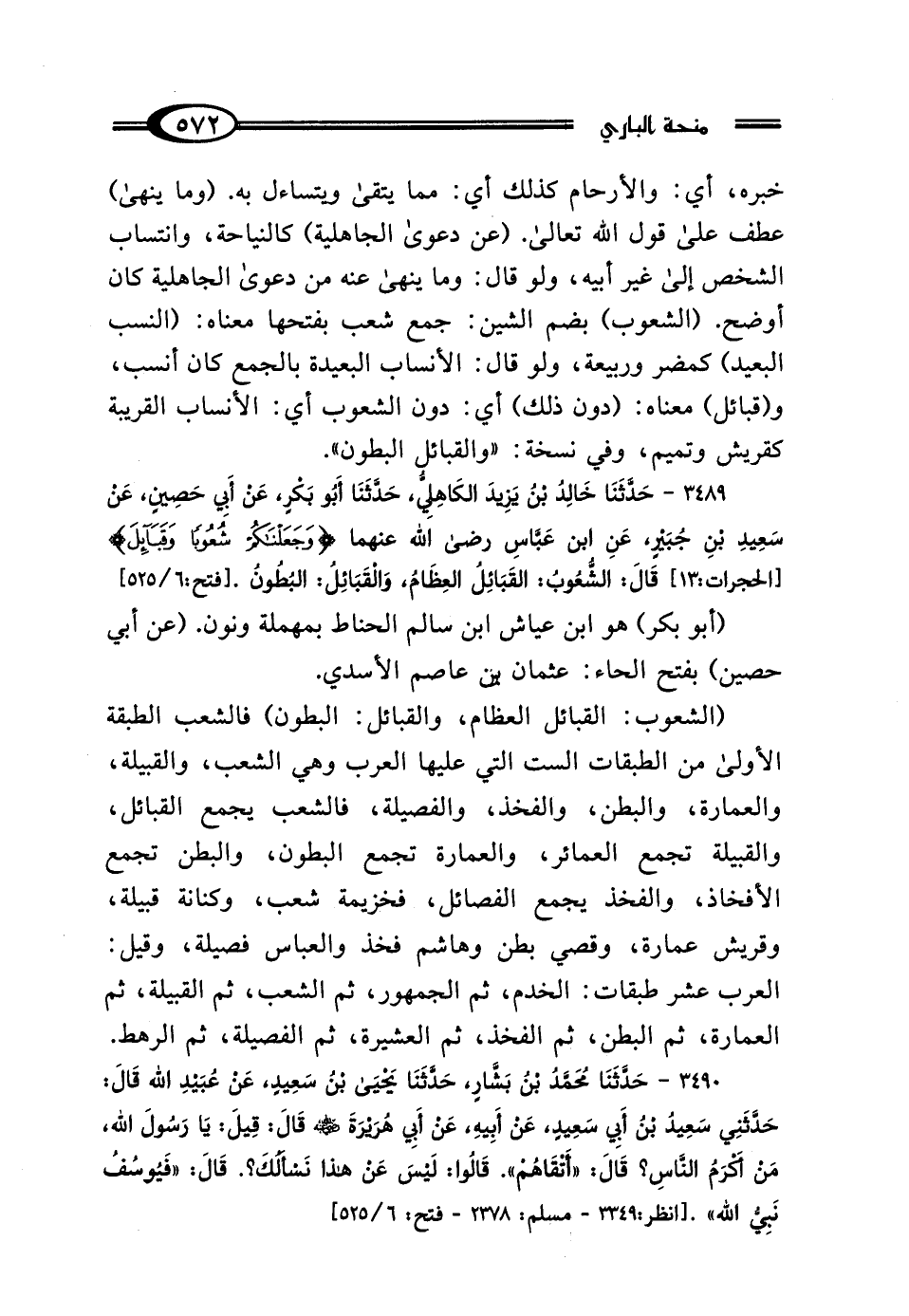 3489 - حَدَّثَنَا خَالِدُ بْنُ يَزِيدَ الكَاهِلِيُّ، حَدَّثَنَا أَبُو بَكْرٍ، عَنْ أَبِي حَصِينٍ، عَنْ سَعِيدِ بْنِ جُبَيْرٍ، عَنِ ابْنِ عَبَّاسٍ رَضِيَ اللَّهُ عَنْهُمَا، {وَجَعَلْنَاكُمْ شُعُوبًا وَقَبَائِلَ لِتَعَارَفُوا} [الحجرات: 13]، قَال: "الشُّعُوبُ: القَبَائِلُ العِظَامُ، وَالقَبَائِلُ: البُطُونُ".