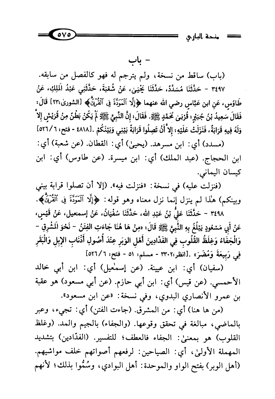3497 - حَدَّثَنَا مُسَدَّدٌ، حَدَّثَنَا يَحْيَى، عَنْ شُعْبَةَ، حَدَّثَنِي عَبْدُ المَلِكِ، عَنْ طَاوُسٍ، عَنِ ابْنِ عَبَّاسٍ رَضِيَ اللَّهُ عَنْهُمَا، {إلا المَوَدَّةَ فِي القُرْبَى} [الشورى: 23]، قَال: فَقَال سَعِيدُ بْنُ جُبَيْرٍ: قُرْبَى مُحَمَّدٍ صَلَّى اللهُ عَلَيْهِ وَسَلَّمَ، فَقَال: "إِنَّ النَّبِيَّ صَلَّى اللهُ عَلَيْهِ وَسَلَّمَ لَمْ يَكُنْ بَطْنٌ مِنْ قُرَيْشٍ، إلا وَلَهُ فِيهِ قَرَابَةٌ، فَنَزَلَتْ عَلَيْهِ: إلا أَنْ تَصِلُوا قَرَابَةً بَيْنِي وَبَيْنَكُمْ".