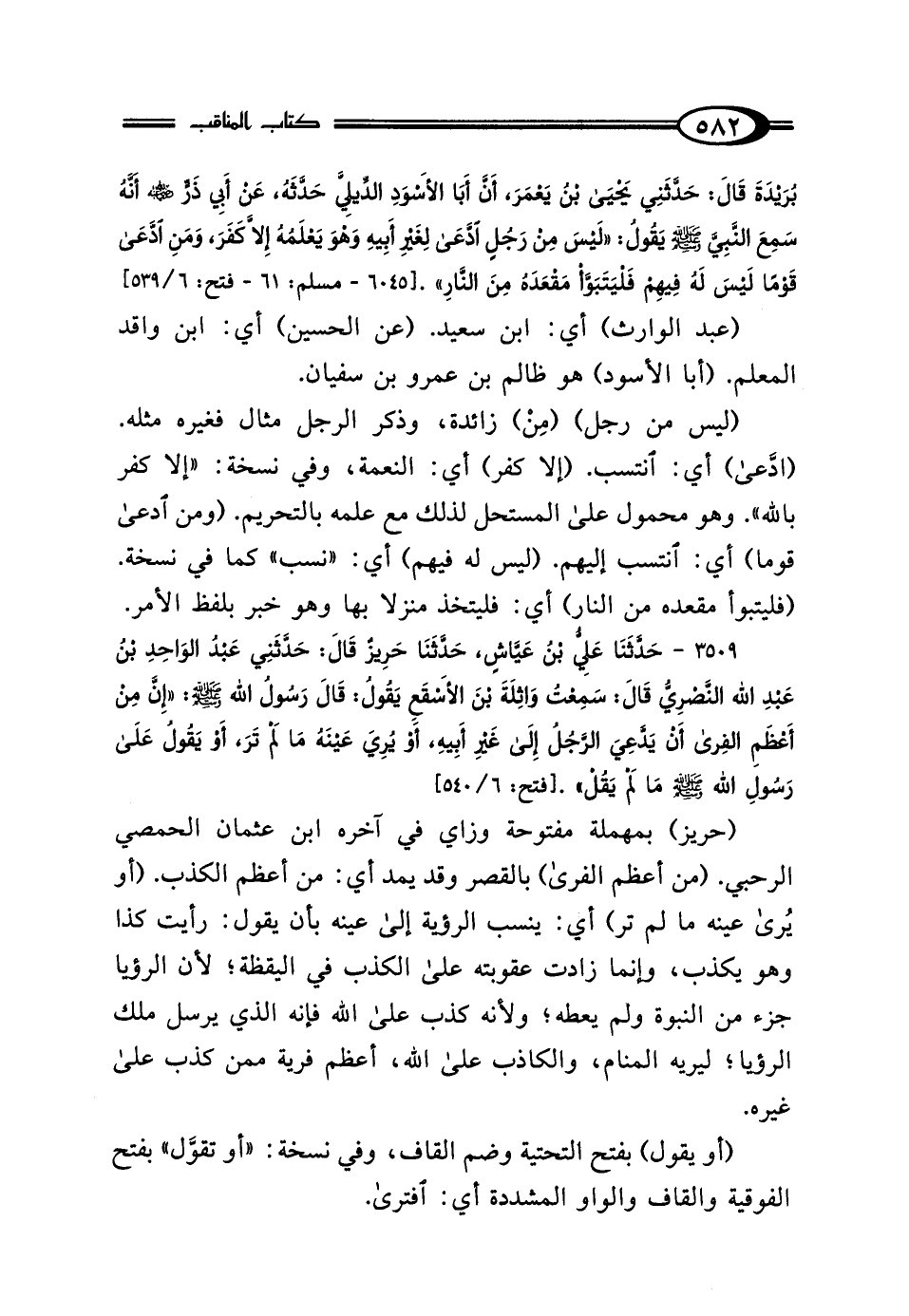 بُرَيْدَةَ، قَال: حَدَّثَنِي يَحْيَى بْنُ يَعْمَرَ، أَنَّ أَبَا الأَسْوَدِ الدِّيلِيَّ، حَدَّثَهُ عَنْ أَبِي ذَرٍّ رَضِيَ اللَّهُ عَنْهُ، أَنَّهُ سَمِعَ النَّبِيَّ صَلَّى اللهُ عَلَيْهِ وَسَلَّمَ، يَقُولُ: "لَيْسَ مِنْ رَجُلٍ ادَّعَى لِغَيْرِ أَبِيهِ - وَهُوَ يَعْلَمُهُ - إلا كَفَرَ، وَمَنِ ادَّعَى قَوْمًا لَيْسَ لَهُ فِيهِمْ، فَلْيَتَبَوَّأْ مَقْعَدَهُ مِنَ النَّارِ".