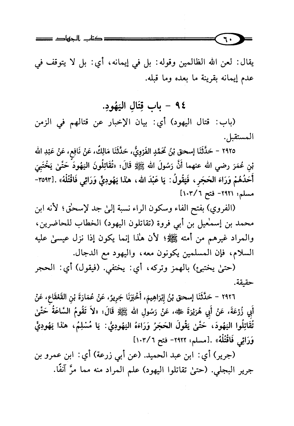 (الفروي) بفتح الفاء وسكون الراء نسبة إلى جد لإسحاق؛ لأنه ابن محمد بن إسماعيل بن أبي فروة (تقاتلون اليهود) الخطاب للحاضرين، والمراد غيرهم من أمته - صلى الله عليه وسلم - لأن هذا إنما يكون إذا نزل عيسى - عليه السلام -، فإن المسلمين يكونون معه، واليهود مع الدجال.