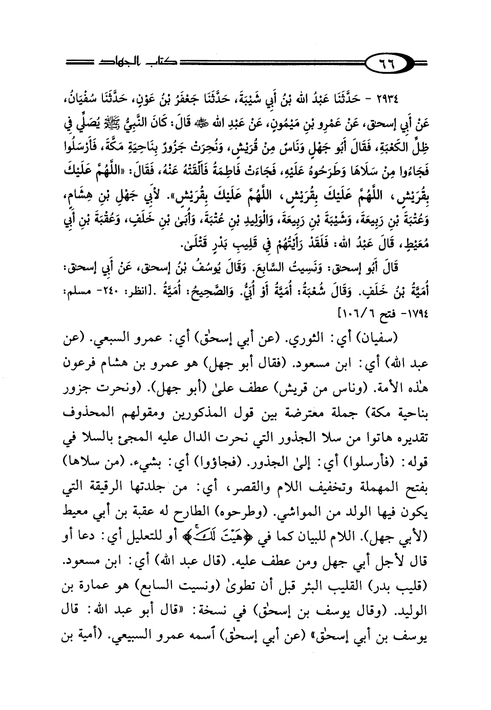 2934 - حَدَّثَنَا عَبْدُ اللَّهِ بْنُ أَبِي شَيْبَةَ، حَدَّثَنَا جَعْفَرُ بْنُ عَوْنٍ، حَدَّثَنَا سُفْيَانُ، عَنْ أَبِي إِسْحَاقَ، عَنْ عَمْرِو بْنِ مَيْمُونٍ، عَنْ عَبْدِ اللَّهِ رَضِيَ اللَّهُ عَنْهُ، قَال: كَانَ النَّبِيُّ صَلَّى اللهُ عَلَيْهِ وَسَلَّمَ يُصَلِّي فِي ظِلِّ الكَعْبَةِ، فَقَال أَبُو جَهْلٍ: وَنَاسٌ مِنْ قُرَيْشٍ، وَنُحِرَتْ جَزُورٌ بِنَاحِيَةِ مَكَّةَ، فَأَرْسَلُوا فَجَاءُوا مِنْ سَلاهَا وَطَرَحُوهُ عَلَيْهِ، فَجَاءَتْ فَاطِمَةُ، فَأَلْقَتْهُ عَنْهُ، فَقَال: "اللَّهُمَّ عَلَيْكَ بِقُرَيْشٍ، اللَّهُمَّ عَلَيْكَ بِقُرَيْشٍ، اللَّهُمَّ عَلَيْكَ بِقُرَيْشٍ" لِأَبِي جَهْلِ بْنِ هِشَامٍ، وَعُتْبَةَ بْنِ رَبِيعَةَ، وَشَيْبَةَ بْنِ رَبِيعَةَ، وَالوَلِيدِ بْنِ عُتْبَةَ، وَأُبَيِّ بْنِ خَلَفٍ، وَعُقْبَةَ بْنِ أَبِي مُعَيْطٍ، قَال عَبْدُ اللَّهِ: فَلَقَدْ رَأَيْتُهُمْ فِي قَلِيبِ بَدْرٍ قَتْلَى، قَال أَبُو إِسْحَاقَ وَنَسِيتُ السَّابِعَ، قَال أَبُو عَبْدِ اللَّهِ: وَقَال يُوسُفُ بْنُ إِسْحَاقَ، عَنْ أَبِي إِسْحَاقَ: أُمَيَّةُ بْنُ خَلَفٍ، وَقَال شُعْبَةُ: أُمَيَّةُ أَوْ أُبَيٌّ "وَالصَّحِيحُ أُمَيَّةُ".