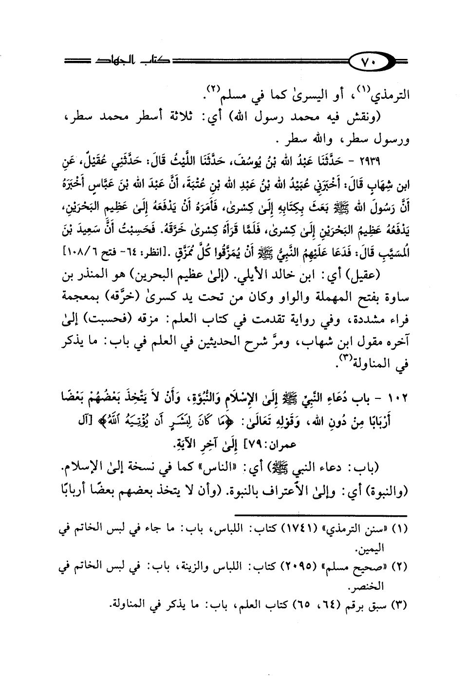 102 - بَابُ دُعَاءِ النَّبِيِّ صَلَّى اللهُ عَلَيْهِ وَسَلَّمَ النَّاسَ إِلَى الإِسْلامِ وَالنُّبُوَّةِ، وَأَنْ لَا يَتَّخِذَ بَعْضُهُمْ بَعْضًا أَرْبَابًا مِنْ دُونِ اللَّهِ، وَقَوْلِهِ تَعَالى: {مَا كَانَ لِبَشَرٍ أَنْ يُؤْتِيَهُ اللَّهُ الكِتَابَ} [آل عمران: 79] إِلَى آخِرِ الآيَةِ.