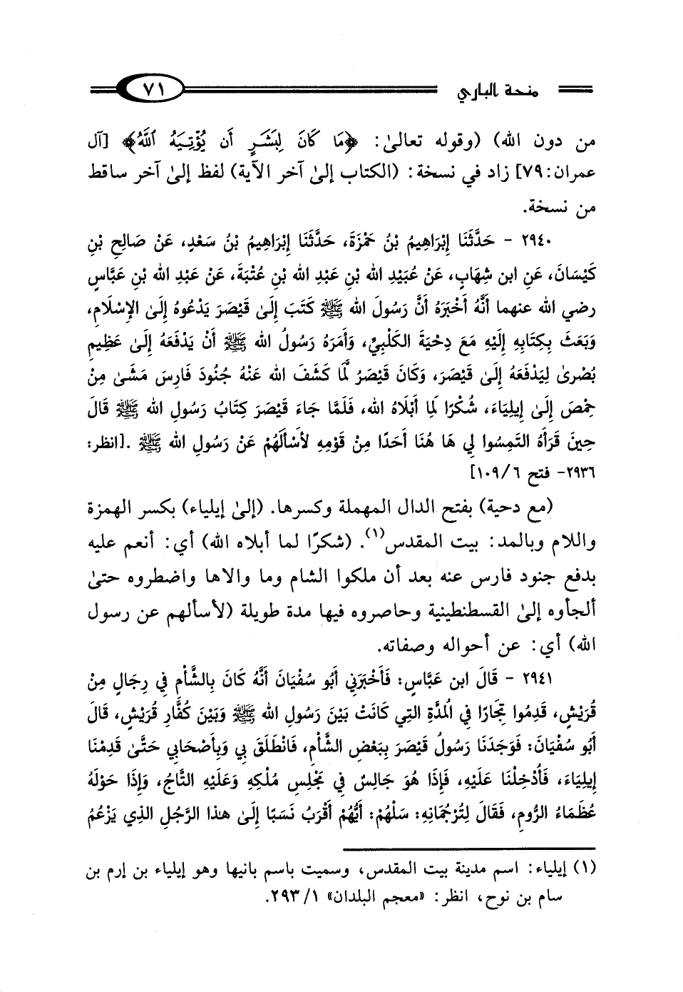 2941 - قَال ابْنُ عَبَّاسٍ، فَأَخْبَرَنِي أَبُو سُفْيَانَ بْنُ حَرْبٍ أَنَّهُ كَانَ بِالشَّأْمِ فِي رِجَالٍ مِنْ قُرَيْشٍ قَدِمُوا تِجَارًا فِي المُدَّةِ الَّتِي كَانَتْ بَيْنَ رَسُولِ اللَّهِ صَلَّى اللهُ عَلَيْهِ وَسَلَّمَ وَبَيْنَ كُفَّارِ قُرَيْشٍ، قَال أَبُو سُفْيَانَ، فَوَجَدَنَا رَسُولُ قَيْصَرَ بِبَعْضِ الشَّأْمِ، فَانْطُلِقَ بِي وَبِأَصْحَابِي، حَتَّى قَدِمْنَا إِيلِيَاءَ، فَأُدْخِلْنَا عَلَيْهِ، فَإِذَا هُوَ جَالِسٌ فِي مَجْلِسِ مُلْكِهِ، وَعَلَيْهِ التَّاجُ، وَإِذَا حَوْلَهُ عُظَمَاءُ الرُّومِ، فَقَال لِتَرْجُمَانِهِ: سَلْهُمْ أَيُّهُمْ أَقْرَبُ نَسَبًا إِلَى هَذَا الرَّجُلِ الَّذِي يَزْعُمُ