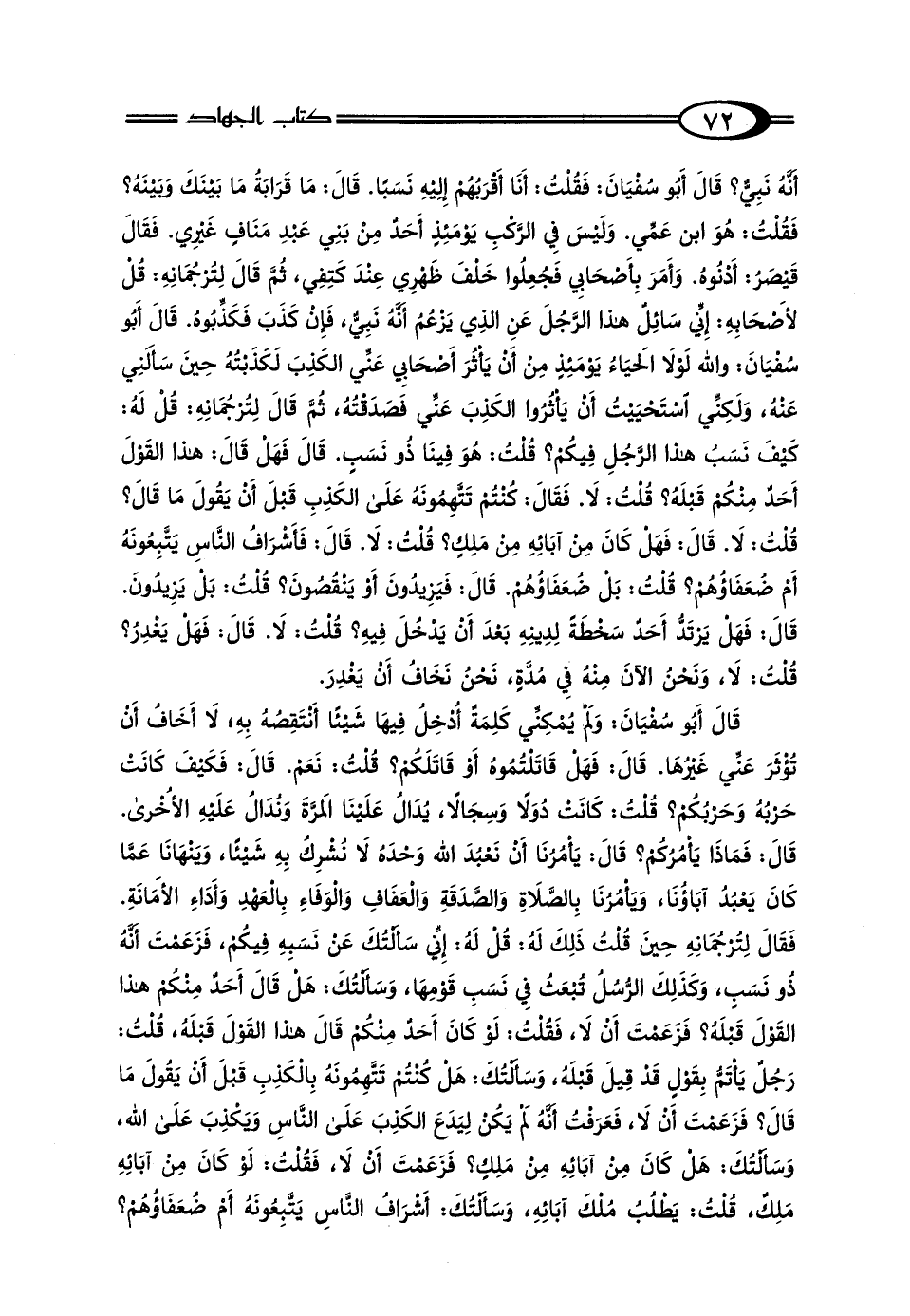 أَنَّهُ نَبِيٌّ، قَال أَبُو سُفْيَانَ: فَقُلْتُ: أَنَا أَقْرَبُهُمْ إِلَيْهِ نَسَبًا، قَال: مَا قَرَابَةُ مَا بَيْنَكَ وَبَيْنَهُ؟ فَقُلْتُ: هُوَ ابْنُ عَمِّي، وَلَيْسَ فِي الرَّكْبِ يَوْمَئِذٍ أَحَدٌ مِنْ بَنِي عَبْدِ مَنَافٍ غَيْرِي، فَقَال قَيْصَرُ: أَدْنُوهُ، وَأَمَرَ بِأَصْحَابِي، فَجُعِلُوا خَلْفَ ظَهْرِي عِنْدَ كَتِفِي، ثُمَّ قَال لِتَرْجُمَانِهِ: قُلْ لِأَصْحَابِهِ: إِنِّي سَائِلٌ هَذَا الرَّجُلَ عَنِ الَّذِي يَزْعُمُ أَنَّهُ نَبِيٌّ، فَإِنْ كَذَبَ فَكَذِّبُوهُ، قَال أَبُو سُفْيَانَ: وَاللَّهِ لَوْلَا الحَيَاءُ يَوْمَئِذٍ، مِنْ أَنْ يَأْثُرَ أَصْحَابِي عَنِّي الكَذِبَ، لَكَذَبْتُهُ حِينَ سَأَلَنِي عَنْهُ، وَلَكِنِّي اسْتَحْيَيْتُ أَنْ يَأْثُرُوا الكَذِبَ عَنِّي، فَصَدَقْتُهُ، ثُمَّ قَال لِتَرْجُمَانِهِ: قُلْ لَهُ كَيْفَ نَسَبُ هَذَا الرَّجُلِ فِيكُمْ؟ قُلْتُ: هُوَ فِينَا ذُو نَسَبٍ، قَال: فَهَلْ قَال هَذَا القَوْلَ أَحَدٌ مِنْكُمْ قَبْلَهُ؟ قُلْتُ: لَا، فَقَال: كُنْتُمْ تَتَّهِمُونَهُ عَلَى الكَذِبِ قَبْلَ أَنْ يَقُولَ مَا قَال؟ قُلْتُ: لَا، قَال: فَهَلْ كَانَ مِنْ آبَائِهِ مِنْ مَلِكٍ؟ قُلْتُ: لَا، قَال: فَأَشْرَافُ النَّاسِ يَتَّبِعُونَهُ أَمْ ضُعَفَاؤُهُمْ؟ قُلْتُ: بَلْ ضُعَفَاؤُهُمْ، قَال: فَيَزِيدُونَ أَوْ يَنْقُصُونَ؟ قُلْتُ: بَلْ يَزِيدُونَ، قَال: فَهَلْ يَرْتَدُّ أَحَدٌ سَخْطَةً لِدِينِهِ بَعْدَ أَنْ يَدْخُلَ فِيهِ؟ قُلْتُ: لَا، قَال: فَهَلْ يَغْدِرُ؟ قُلْتُ: لَا، وَنَحْنُ الآنَ مِنْهُ فِي مُدَّةٍ، نَحْنُ نَخَافُ أَنْ يَغْدِرَ، - قَال أَبُو سُفْيَانَ: وَلَمْ يُمْكِنِّي كَلِمَةٌ أُدْخِلُ فِيهَا شَيْئًا أَنْتَقِصُهُ بِهِ، لَا أَخَافُ أَنْ تُؤْثَرَ عَنِّي غَيْرُهَا -، قَال: فَهَلْ قَاتَلْتُمُوهُ أَوْ قَاتَلَكُمْ؟ قُلْتُ: نَعَمْ، قَال: فَكَيْفَ كَانَتْ حَرْبُهُ وَحَرْبُكُمْ؟ قُلْتُ: كَانَتْ دُوَلًا وَسِجَالًا، يُدَالُ عَلَيْنَا المَرَّةَ، وَنُدَالُ عَلَيْهِ الأُخْرَى، قَال: فَمَاذَا يَأْمُرُكُمْ بِهِ؟ قَال: يَأْمُرُنَا أَنْ نَعْبُدَ اللَّهَ وَحْدَهُ لَا نُشْرِكُ بِهِ شَيْئًا، وَيَنْهَانَا عَمَّا كَانَ يَعْبُدُ آبَاؤُنَا، وَيَأْمُرُنَا بِالصَّلاةِ، وَالصَّدَقَةِ، وَالعَفَافِ، وَالوَفَاءِ بِالعَهْدِ، وَأَدَاءِ الأَمَانَةِ، فَقَال لِتَرْجُمَانِهِ حِينَ قُلْتُ ذَلِكَ لَهُ: قُلْ لَهُ: إِنِّي سَأَلْتُكَ عَنْ نَسَبِهِ فِيكُمْ، فَزَعَمْتَ أَنَّهُ ذُو نَسَبٍ، وَكَذَلِكَ الرُّسُلُ تُبْعَثُ فِي نَسَبِ قَوْمِهَا، وَسَأَلْتُكَ: هَلْ قَال أَحَدٌ مِنْكُمْ هَذَا القَوْلَ قَبْلَهُ، فَزَعَمْتَ أَنْ لَا، فَقُلْتُ: لَوْ كَانَ أَحَدٌ مِنْكُمْ قَال هَذَا القَوْلَ قَبْلَهُ، قُلْتُ رَجُلٌ يَأْتَمُّ بِقَوْلٍ قَدْ قِيلَ قَبْلَهُ، وَسَأَلْتُكَ: هَلْ كُنْتُمْ تَتَّهِمُونَهُ بِالكَذِبِ قَبْلَ أَنْ يَقُولَ مَا قَال، فَزَعَمْتَ أَنْ لَا، فَعَرَفْتُ أَنَّهُ لَمْ يَكُنْ لِيَدَعَ الكَذِبَ عَلَى النَّاسِ وَيَكْذِبَ عَلَى اللَّهِ، وَسَأَلْتُكَ: هَلْ كَانَ مِنْ آبَائِهِ مِنْ مَلِكٍ، فَزَعَمْتَ أَنْ لَا، فَقُلْتُ لَوْ كَانَ مِنْ آبَائِهِ مَلِكٌ، قُلْتُ يَطْلُبُ مُلْكَ آبَائِهِ، وَسَأَلْتُكَ: أَشْرَافُ النَّاسِ يَتَّبِعُونَهُ أَمْ ضُعَفَاؤُهُمْ؟