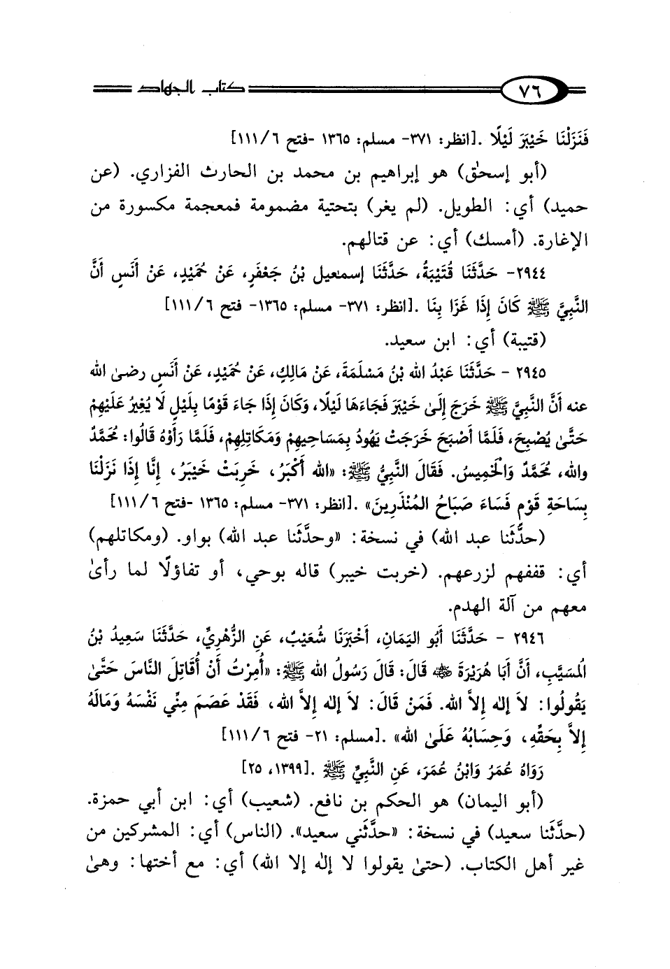 2945 - حَدَّثَنَا عَبْدُ اللَّهِ بْنُ مَسْلَمَةَ، عَنْ مَالِكٍ، عَنْ حُمَيْدٍ، عَنْ أَنَسٍ رَضِيَ اللَّهُ عَنْهُ: أَنَّ النَّبِيَّ صَلَّى اللهُ عَلَيْهِ وَسَلَّمَ خَرَجَ إِلَى خَيْبَرَ، فَجَاءَهَا لَيْلًا، وَكَانَ إِذَا جَاءَ قَوْمًا بِلَيْلٍ لَا يُغِيرُ عَلَيْهِمْ حَتَّى يُصْبِحَ، فَلَمَّا أَصْبَحَ خَرَجَتْ يَهُودُ بِمَسَاحِيهِمْ وَمَكَاتِلِهِمْ، فَلَمَّا رَأَوْهُ قَالُوا: مُحَمَّدٌ وَاللَّهِ، مُحَمَّدٌ وَالخَمِيسُ، فَقَال النَّبِيُّ صَلَّى اللهُ عَلَيْهِ وَسَلَّمَ: "اللَّهُ أَكْبَرُ، خَرِبَتْ خَيْبَرُ إِنَّا إِذَا نَزَلْنَا بِسَاحَةِ قَوْمٍ، فَسَاءَ صَبَاحُ المُنْذَرِينَ".