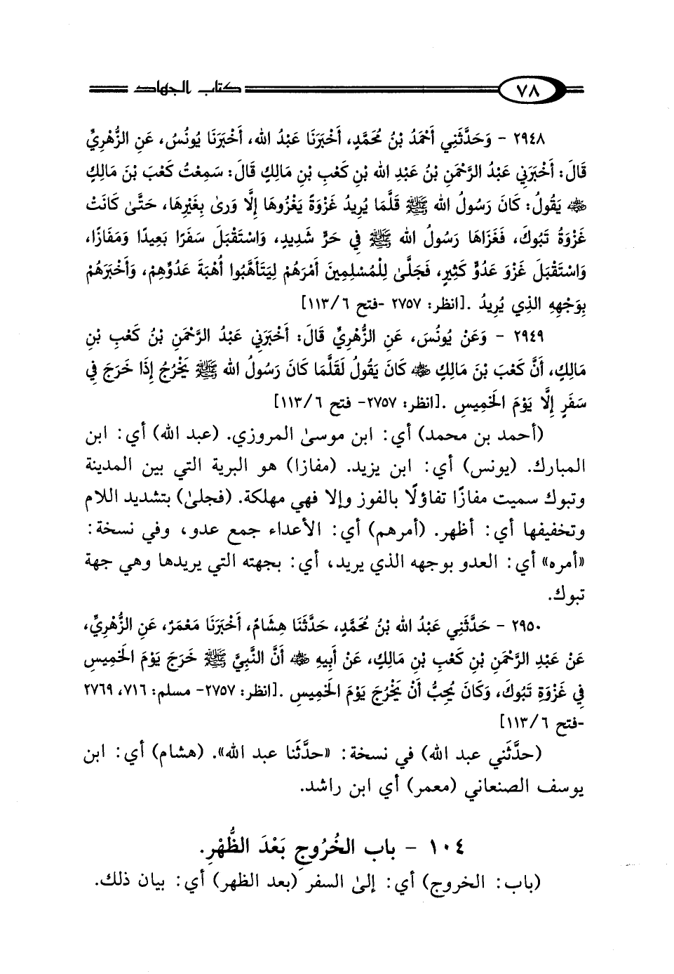 2950 - حَدَّثَنِي عَبْدُ اللَّهِ بْنُ مُحَمَّدٍ، حَدَّثَنَا هِشَامٌ، أَخْبَرَنَا مَعْمَرٌ، عَنِ الزُّهْرِيِّ، عَنْ عَبْدِ الرَّحْمَنِ بْنِ كَعْبِ بْنِ مَالِكٍ، عَنْ أَبِيهِ رَضِيَ اللَّهُ عَنْهُ، "أَنَّ النَّبِيَّ صَلَّى اللهُ عَلَيْهِ وَسَلَّمَ خَرَجَ يَوْمَ الخَمِيسِ فِي غَزْوَةِ تَبُوكَ وَكَانَ يُحِبُّ أَنْ يَخْرُجَ يَوْمَ الخَمِيسِ".